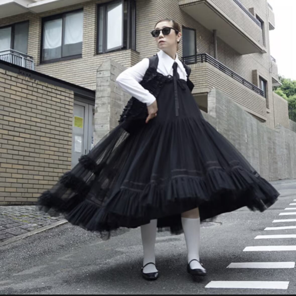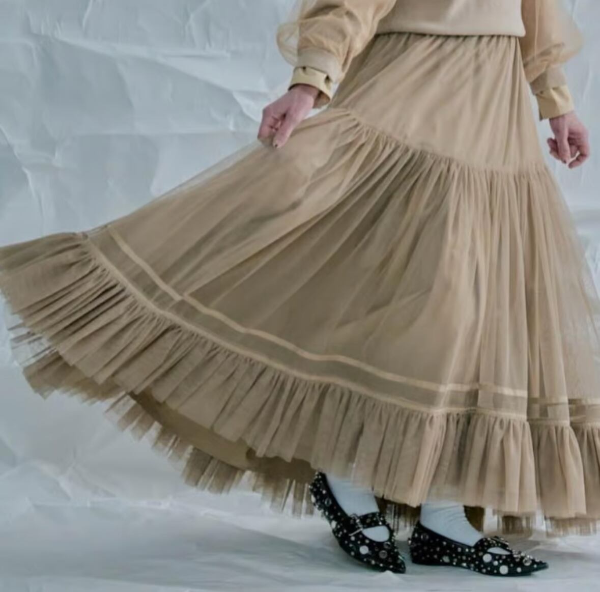 沢山のチュールスカートを作ってきましたが、透けるタイプが多かったので、1枚で迫力のあるボリュームになっています。たっぷりとしたギャザーは太もも辺りから切り替えてギャザーにしました。ウエスト部分には多すぎないギャザーになるので、ヒップ周りをほっそりと見えるようにしています。ティアードになっていて更に裾にかけて沢山のギャザーが入ります。