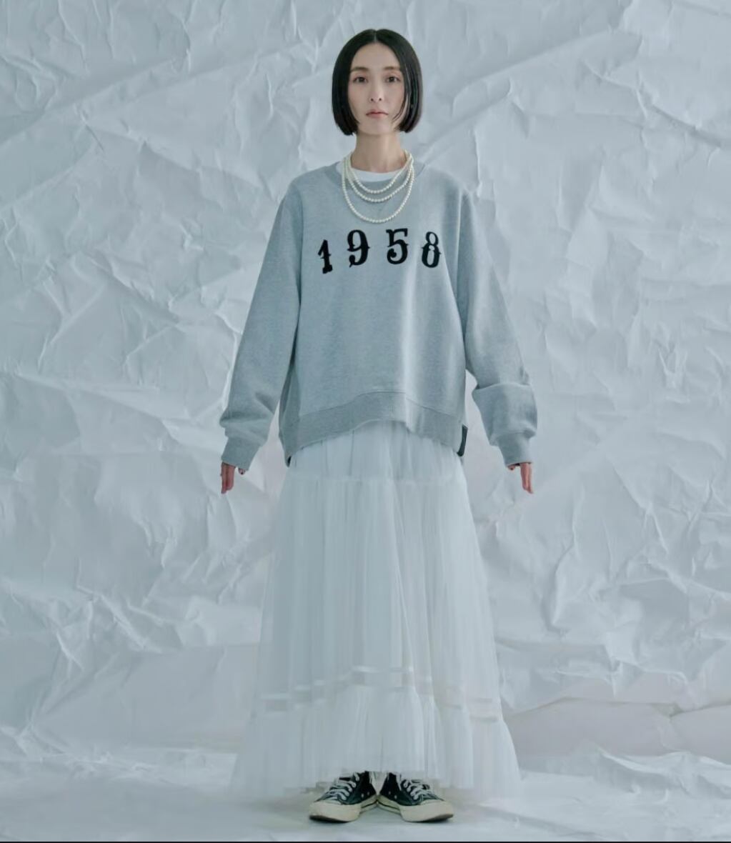 トップには古着のスウェット、夏はTシャツも良いと思います。普段用として使っていただきたいのですが、結婚式のお呼ばれの特別な一着としても活用ができそうです。またトップにジャケットを着てベルトをすれば、パーティー、お食事などにも使えそう。結婚式などにはワンピースドレスが定番ですが、組み合わせの楽しみもあっても良いのではないかなと思います。トップを変えるだけで、違った印象になり楽しめる一枚。