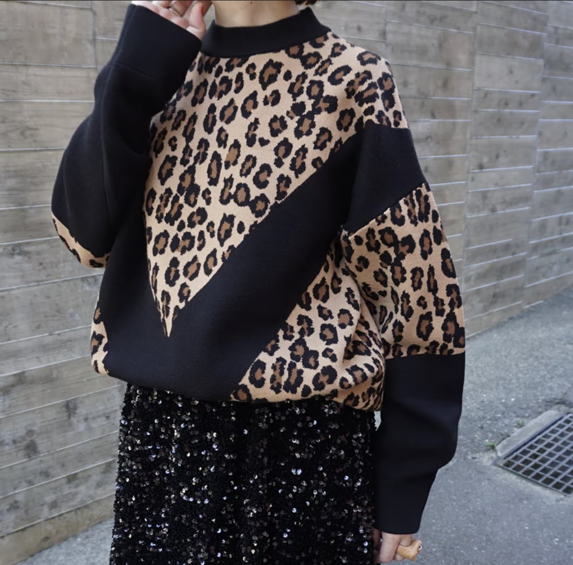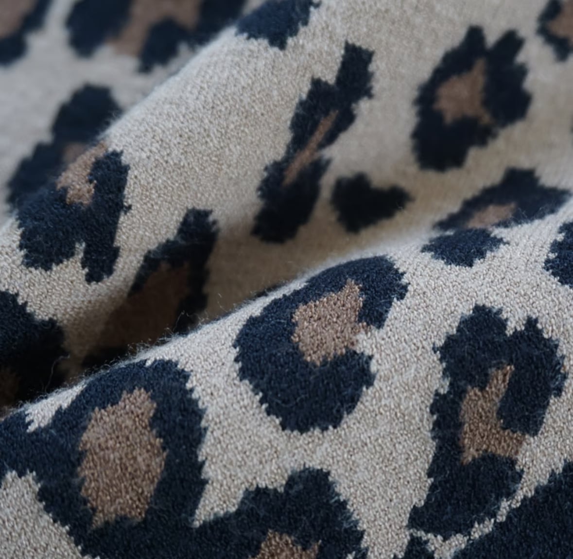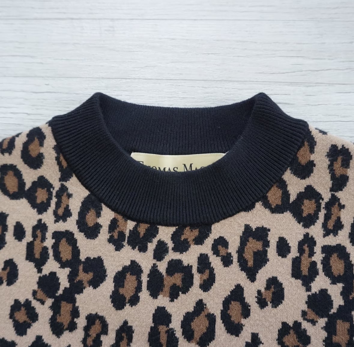 レオパードは定期的に出している大好きな柄です。今回はニットでオリジナルの柄を作りました。トーマスマグパイだけのオリジナルデザインの柄になっています。ニットは柄はどれもオリジナルで、毎回苦心しながらデザインしていますが、レオパードの柄は初めてのチャレンジです。定期的に着なくなる時期がありますが、数年おきにレオパードに対するブームがあるのか、今年の冬にまた着たいなと思いデザインしました。