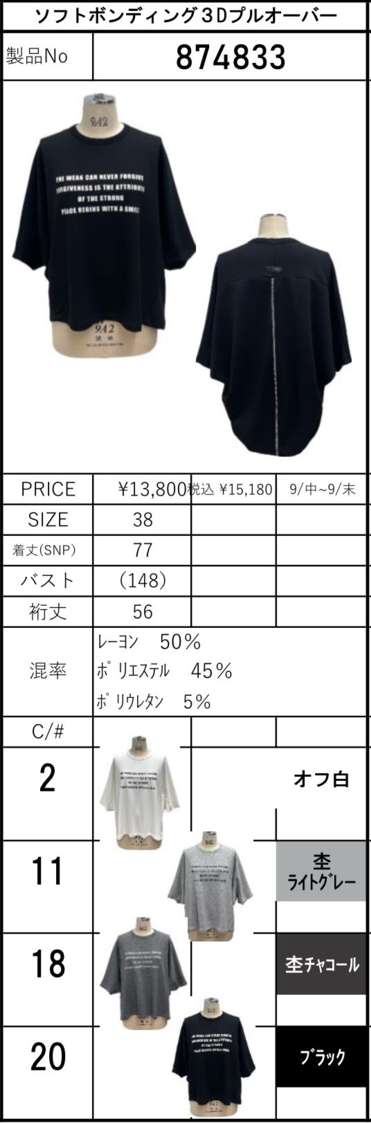 メーカー受注書に記載されている、デザイナー指示のサイズ・カラー表記を掲載しております。