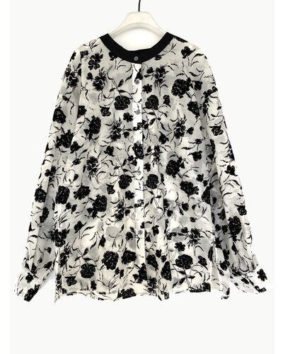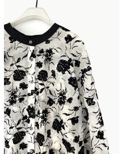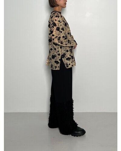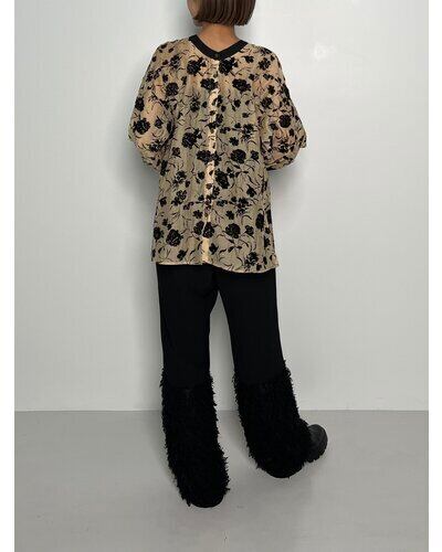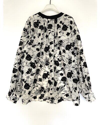 光沢のある別布で作られた衿と、フロッキーのフラワープリントが華やかな前後着用可能な2WAYデザインブラウスです。