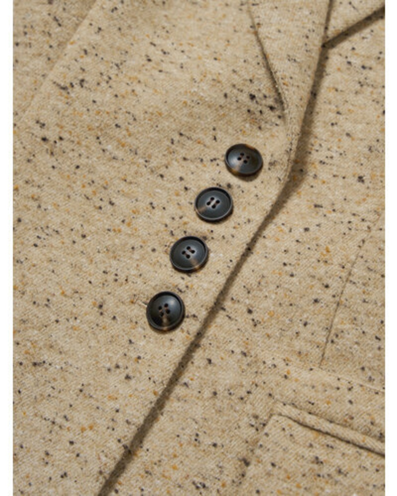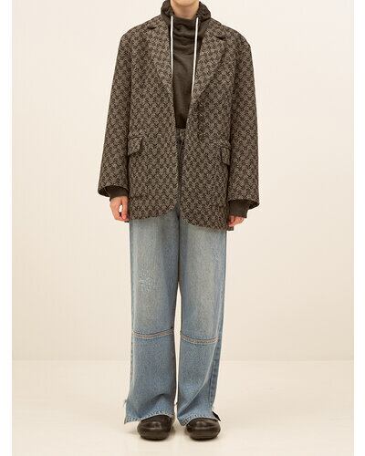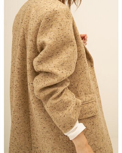 メンズライクな肩が強調されたシルエットですが、肩に入れる綿の代わりに同素材の生地を使用することで強くなりすぎない自然なボックスシルエットを作っています。ポケットはあえてパッチにすることでカジュアル感と遊びをプラスしました。サイズ感は程よいオーバーサイズで、中にニットなどしっかり着込むことができます。レトロな雰囲気の素材と今っぽいシルエットのジャケットコートは、トレンド感のある今年らしい1枚です。