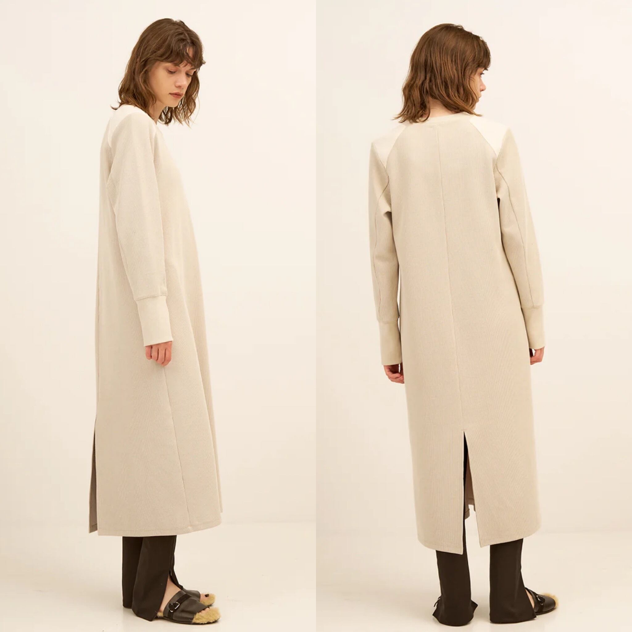 スッキリと細見えするシルエットですが、二の腕やヒップ周りはややゆとりを持たせたパターンで仕上げています。