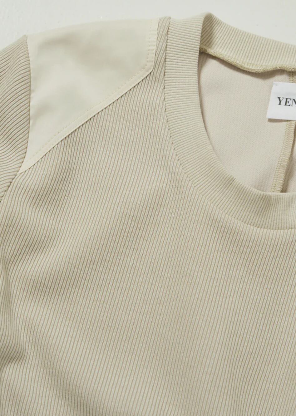 ニットライクに見えるリブ目のカットソーで、身体のラインを拾いにくく、だれにくいので