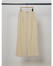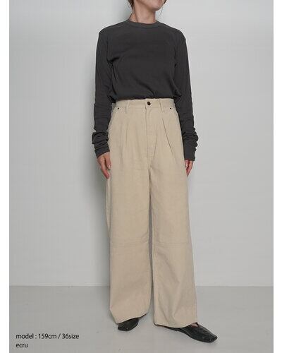 本来は毛羽立ちやすく摩擦に弱い素材ですが、あえて製品洗い加工を入れることで履き馴染んだようなこなれた印象に仕上げました。 YENN定番デニムの1つ”TUCK WIDE DENIM”の形をベースにしていますので、ハイウエスト+タックで女性でも履きやすいきれいなシルエットになっています。 ※裾の段違いデザインはありません