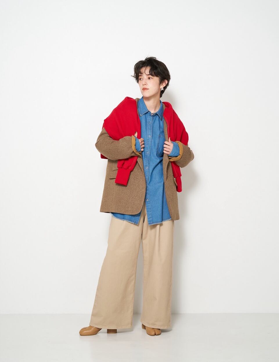 柔らかいデニム素材にはブリーチ加工を、ツイル素材にはストーンバイオ加工を入れ、ヴィンテージ感を出しています。裾のカットオフ仕様もポイントです。