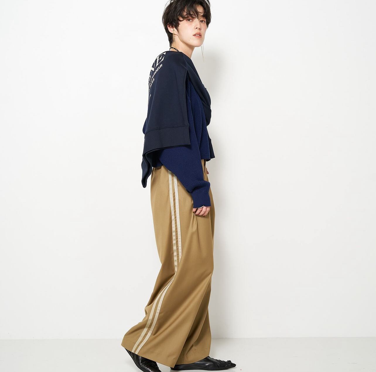 ワイドなシルエットと合わせやすいショート丈で、インナーにも1枚着にも万能に着用して頂けます。