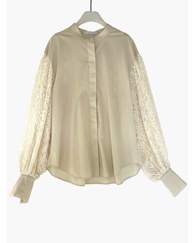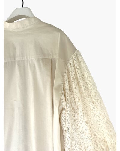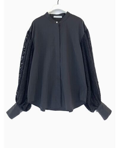 身頃はストレッチの効いた着心地の良い素材を使い、袖はベロアレースで切り替えた異素材使いのブラウスです。