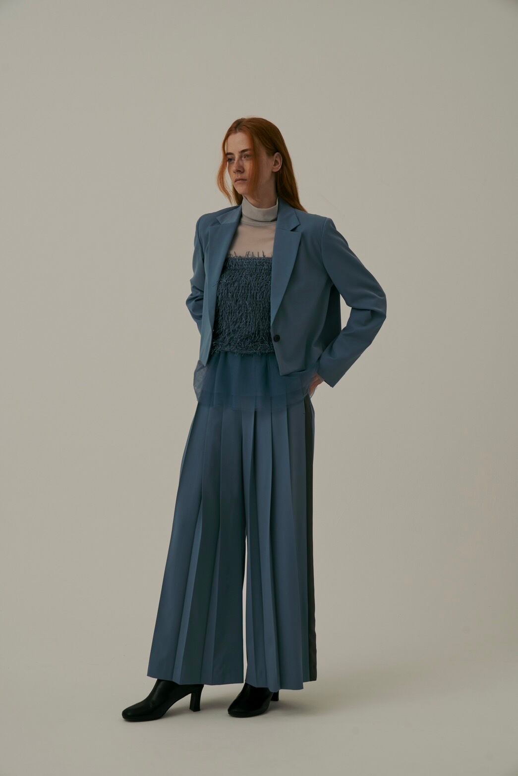 フロントプリーツのドレープが美しく、着用時にプリーツが揺れる動きのあるシルエットがエレガントなパンツ。身体のラインを拾わず、プリーツの縦ラインが視覚的に強調されて、スタイルが細く長く見えるデザイン。脇の側章は微配色となり、さり気ないアクセントとなっています。同素材のジャケットとのセットアップコーデも可能です。