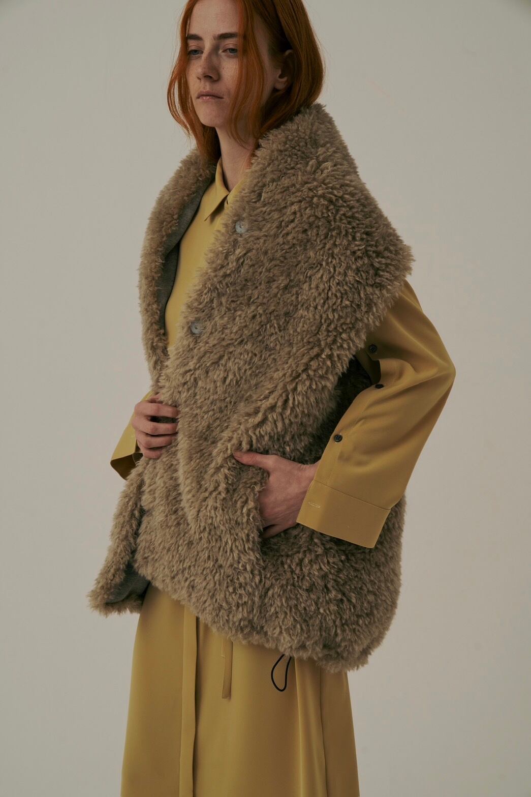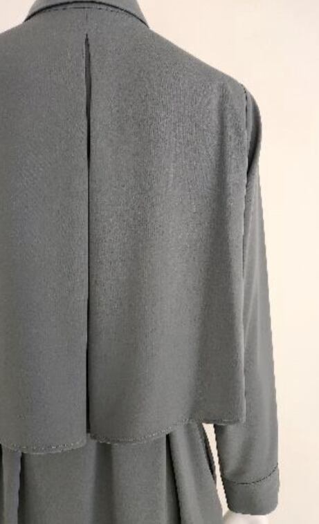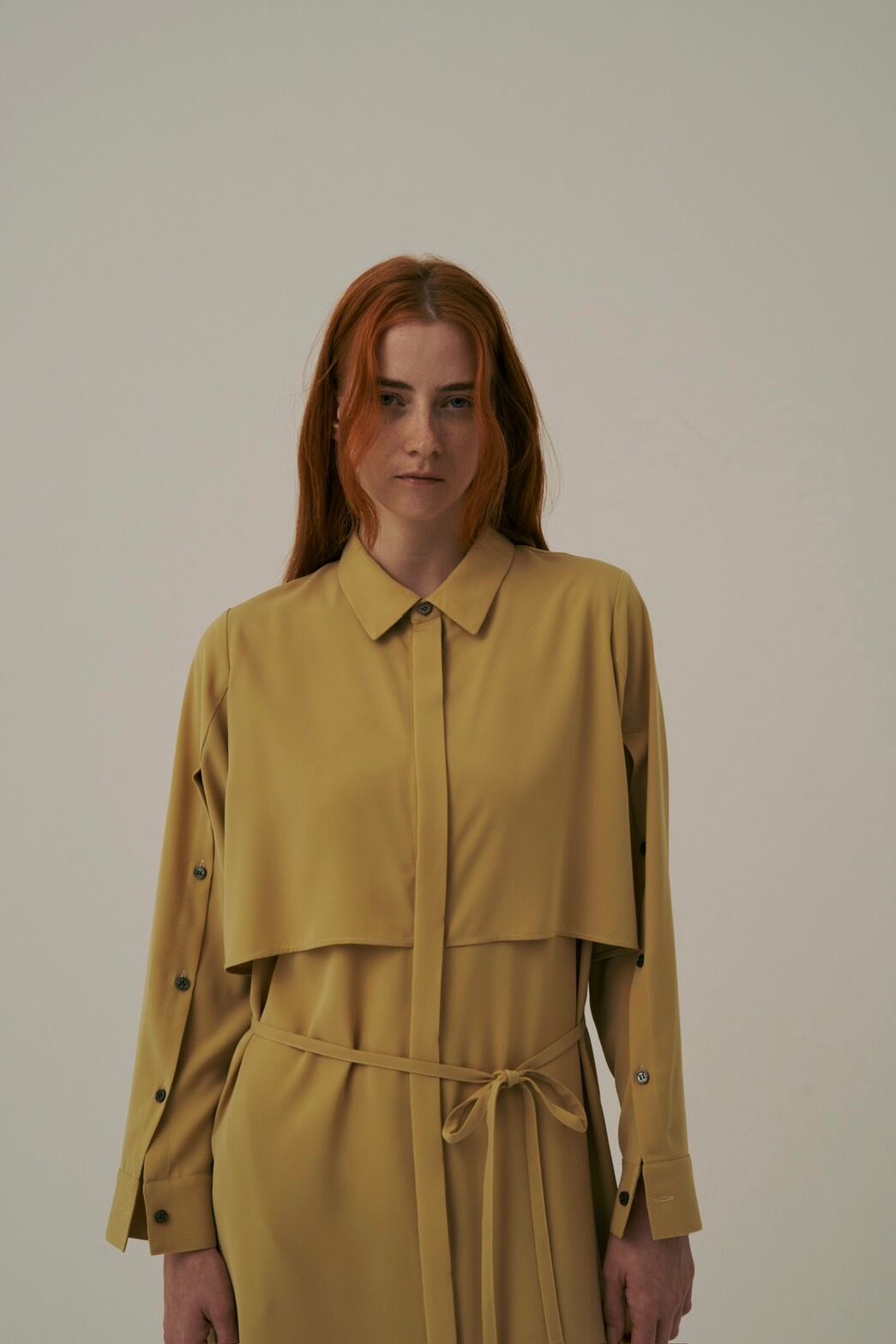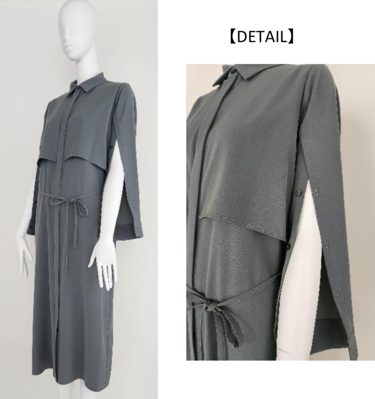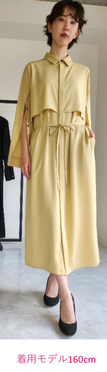 ヨークのディテールが、ウエストとのギャップを作りスタイルアップ。袖に女性らしい印象を与えるケープスリットを採用し、釦で開閉出来る2way仕様で、開けるとケープの様なこなれ感をスタイリングにプラスします。ドレスとして一枚で着ることは勿論、パンツにレイヤードしてスタイリングするなど様々なコーディネートを楽しむことができます。両脇にポケット有り、共布ウエストリボン付き。