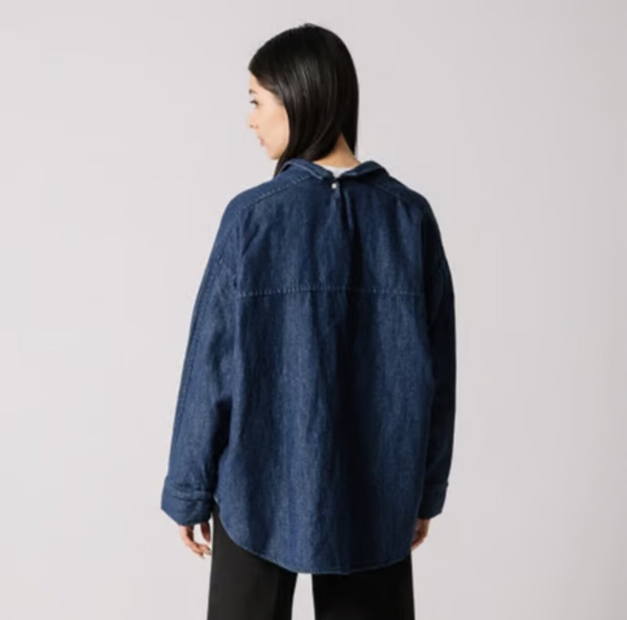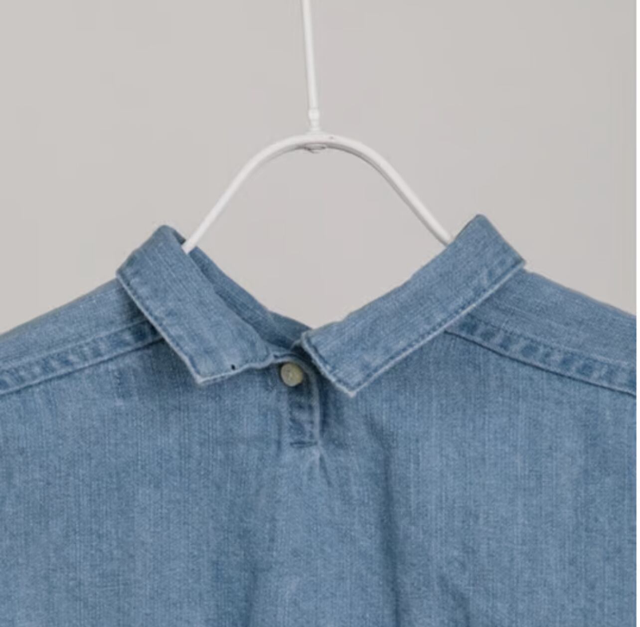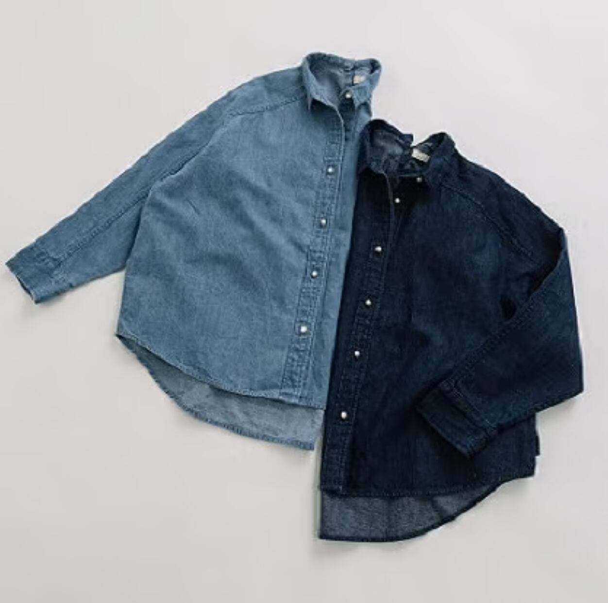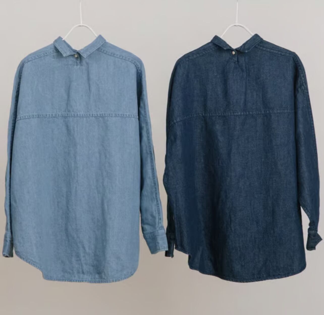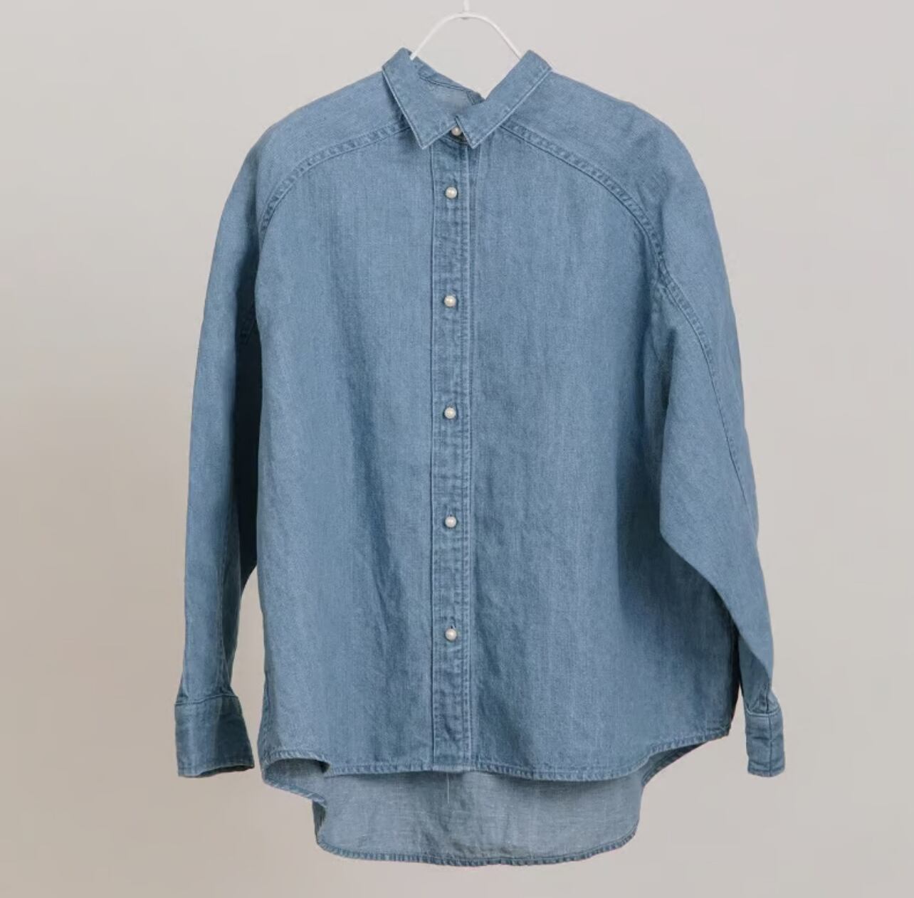 綿麻のデニム素材を使用したパールボタンシャツ。