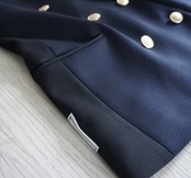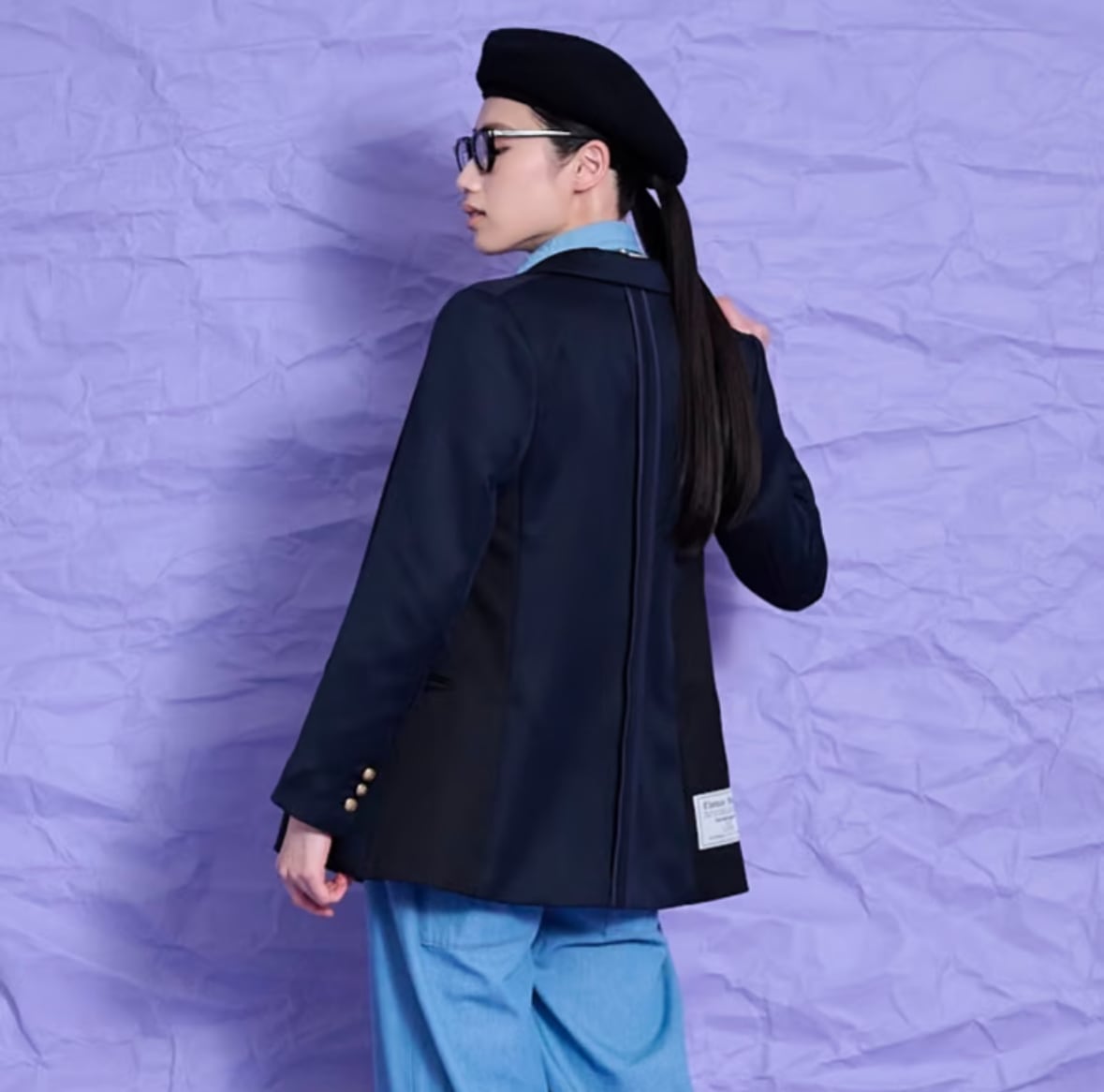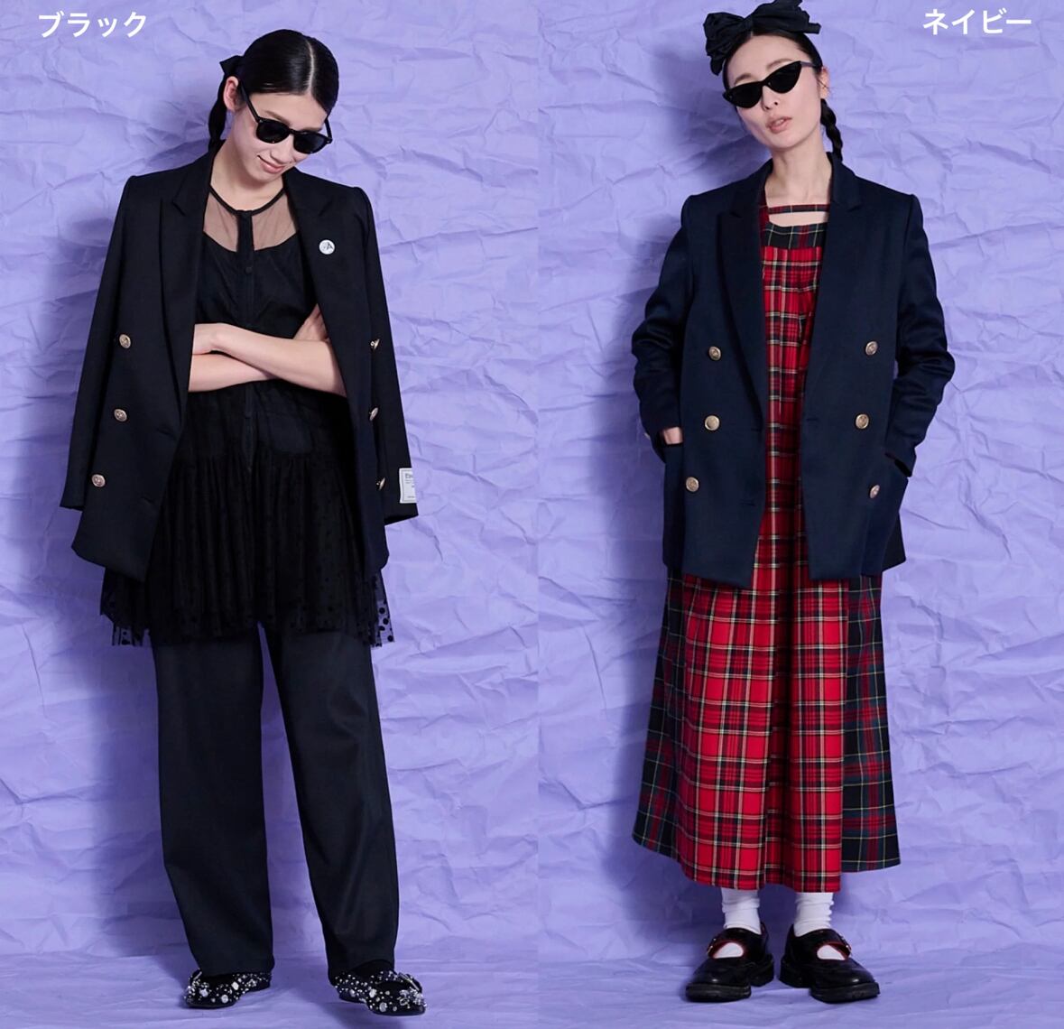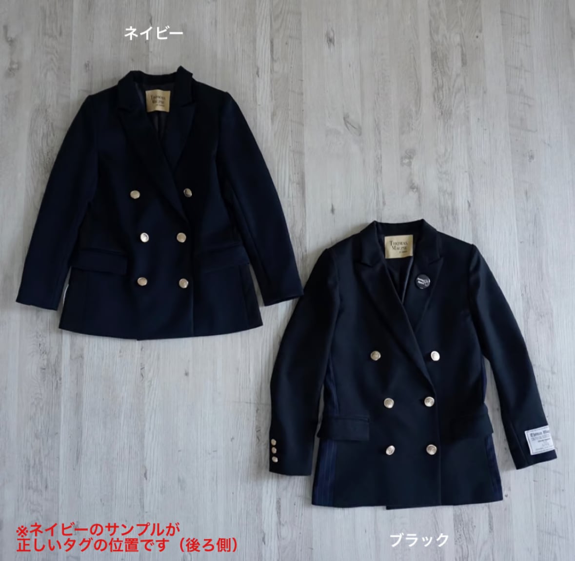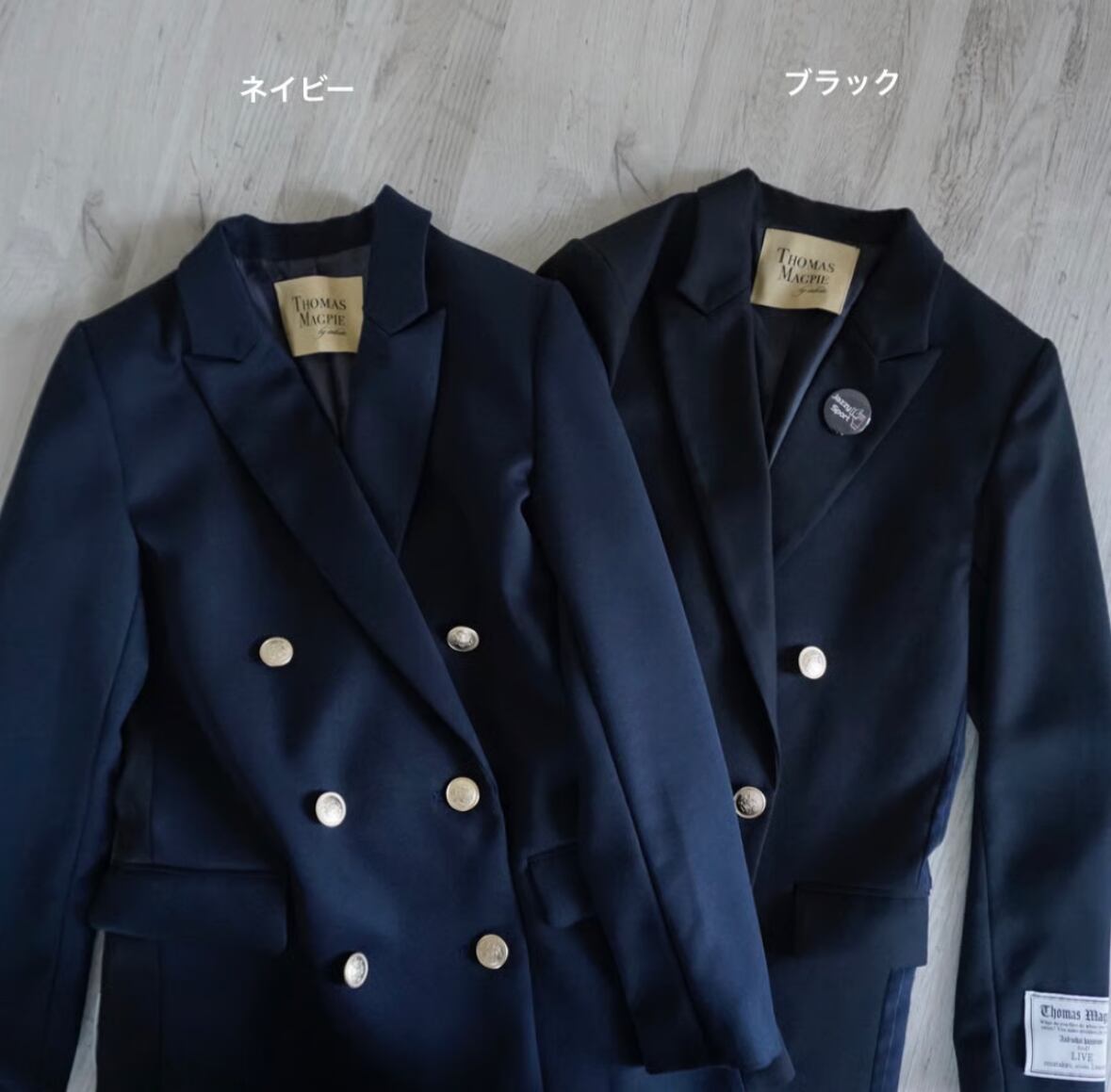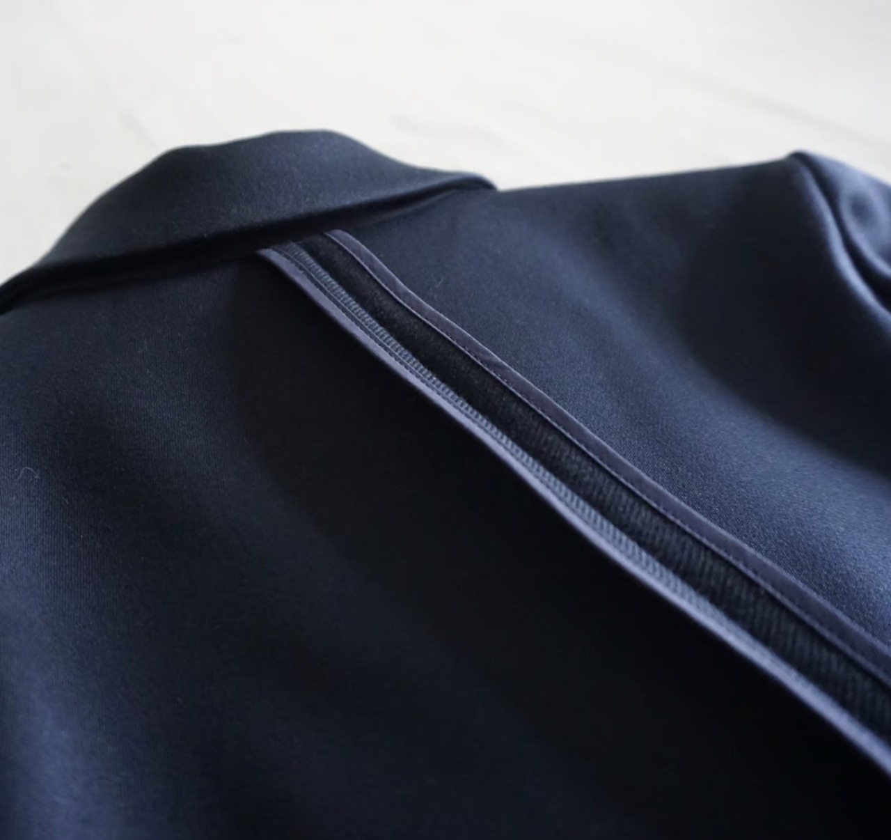 以前出していたテーラードジャケットのリピートです。前回出したときにあまりにも人気があり、すぐに完売してしまったので今回も再販をいたします。このジャケットは日本製でとても良い生地を使っています。ストレッチがあり、ポリエステルレーヨンの艶感のあるシックな素材です。ネイビーは身頃のサイドにブラックのカラー切り替えを入れて、後ろの背中中心には、縫代を外に出してパイピングが出ています。その部分がこだわった小さな個性です。