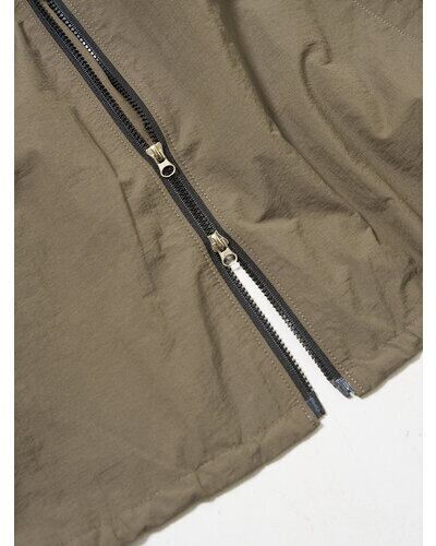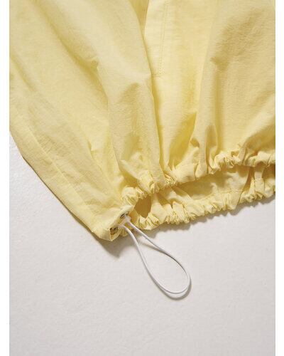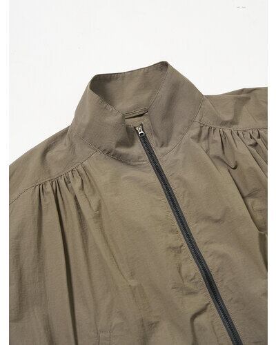 ナイロンのスポーティーなハリ感と綿のさらっとしたマットな質感を兼ね備えた生地を採用。肌離れの良いふんわりと浮くシルエットを実現しています。纏うと空気を含んだような膨らみを生むギャザーデザインが女性らしさもプラスしてくれます。 シワが気にならない素材感で旅行など持ち運びにも便利です。 前を閉めればシャツブラウスのようにトップスとしての着用もおすすめです。
