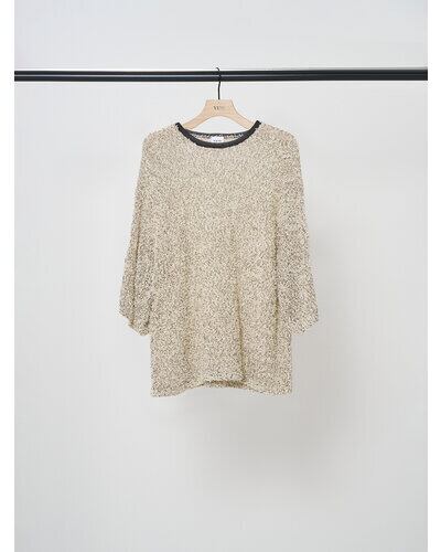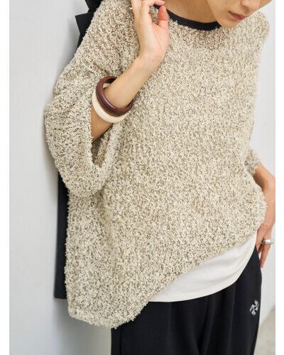 ドライタッチなリボンヤーンとストレートヤーンを引き揃え、あえて度甘に編むことで、軽やかに大人っぽく仕上げたニットプルオーバーです。
