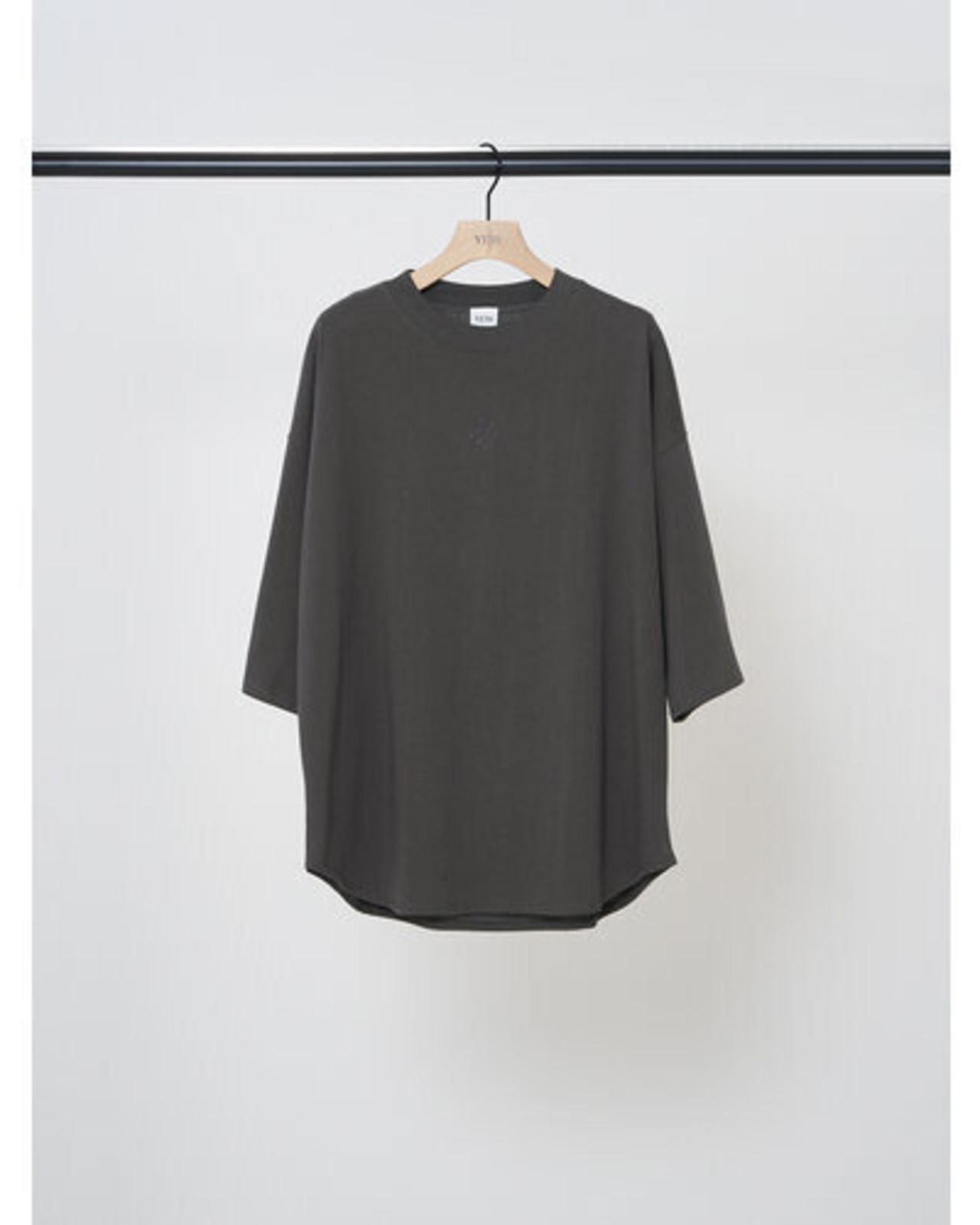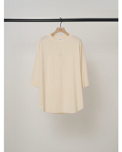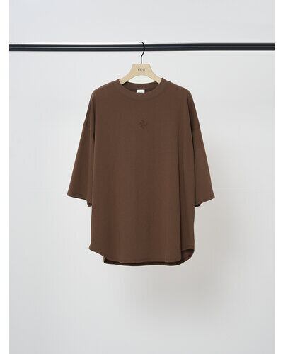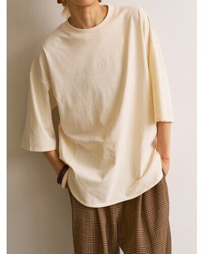 フロントに同色のワンポイント刺繍を施した6分袖のワイドTシャツです。