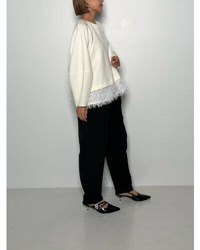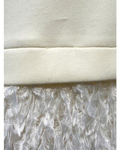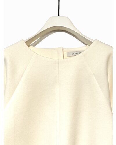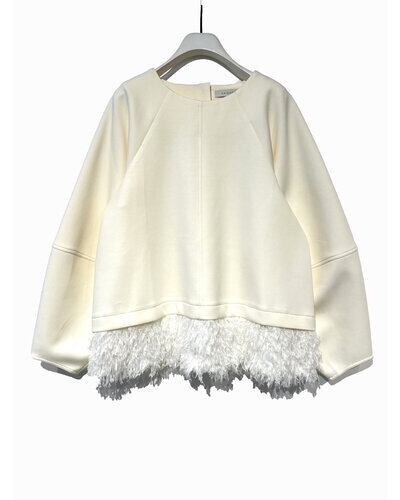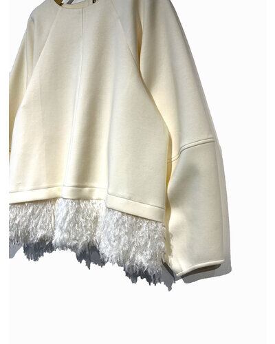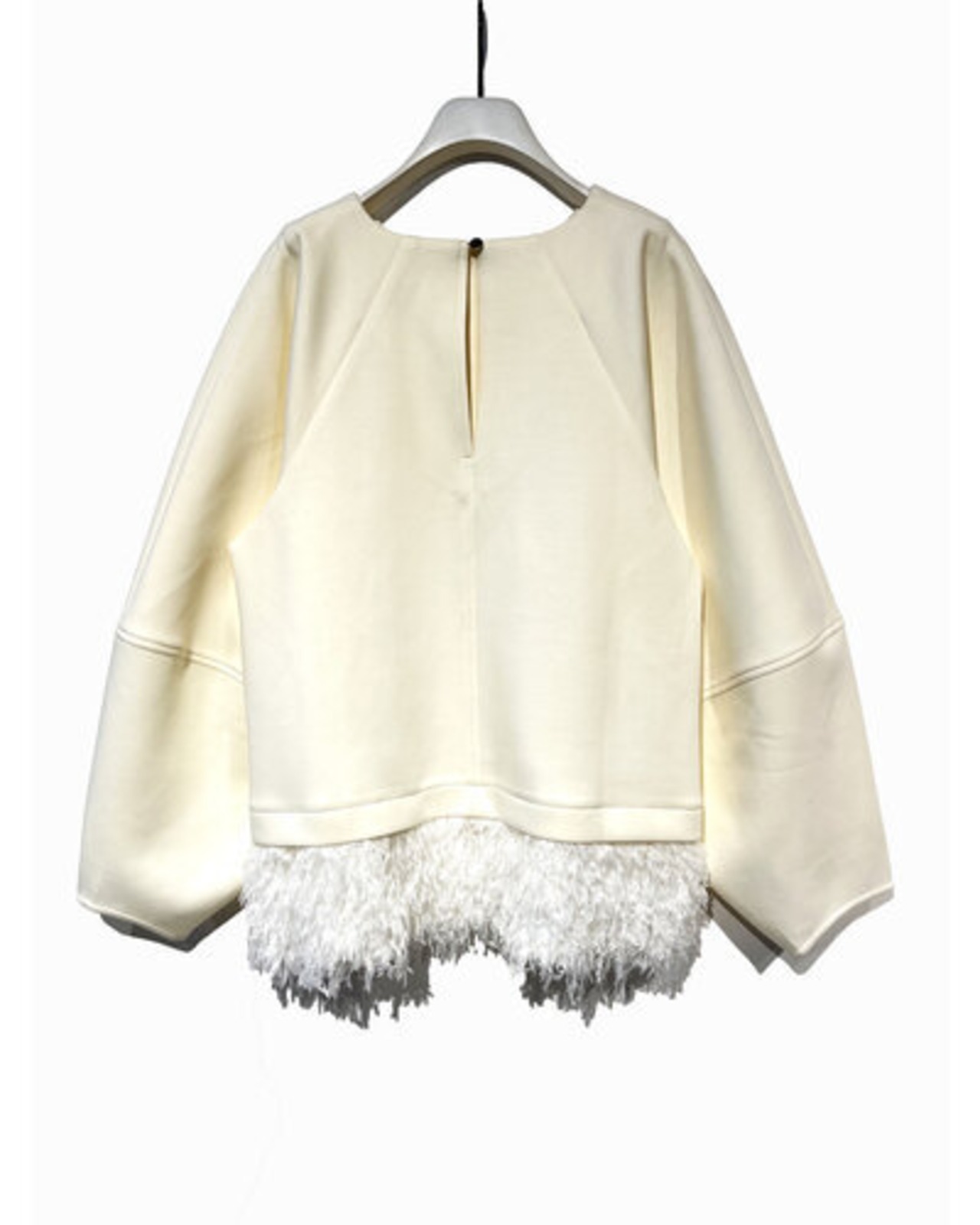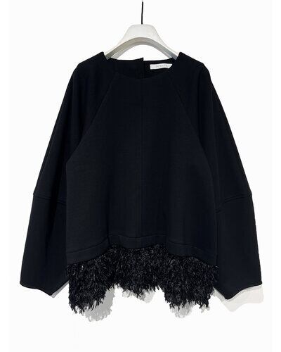 ダンボール素材を採用したデザイントップスです。袖はランタンスリーブに設計し、構築的且つ女性らしい印象に。ヘムはフェザーライクなフリンジで切り替え華やかな印象に。ジャージー素材でリラックスな着心地を設計しながらもきちんと感を演出しました。