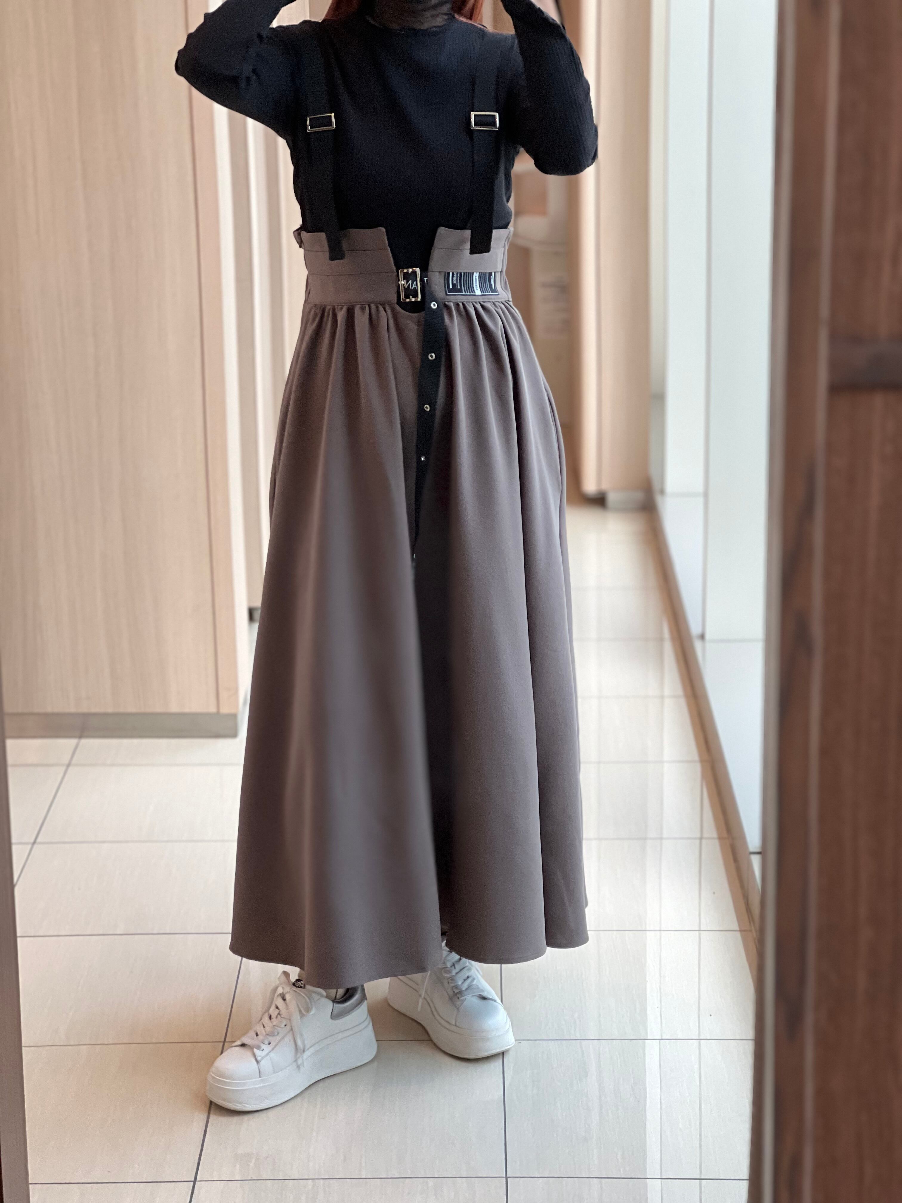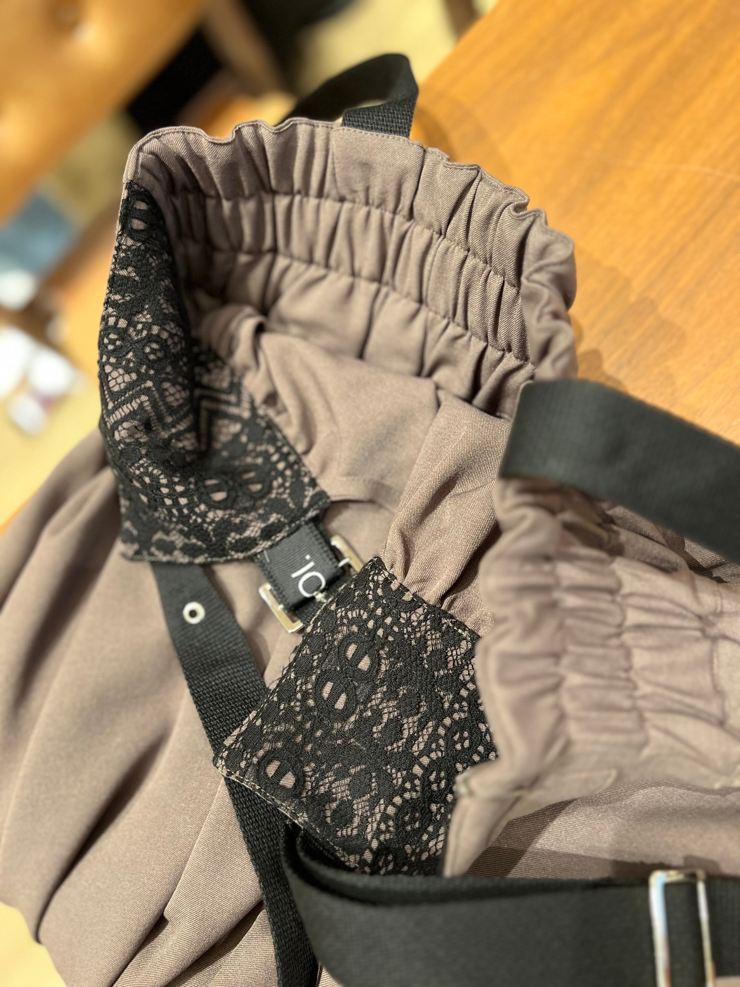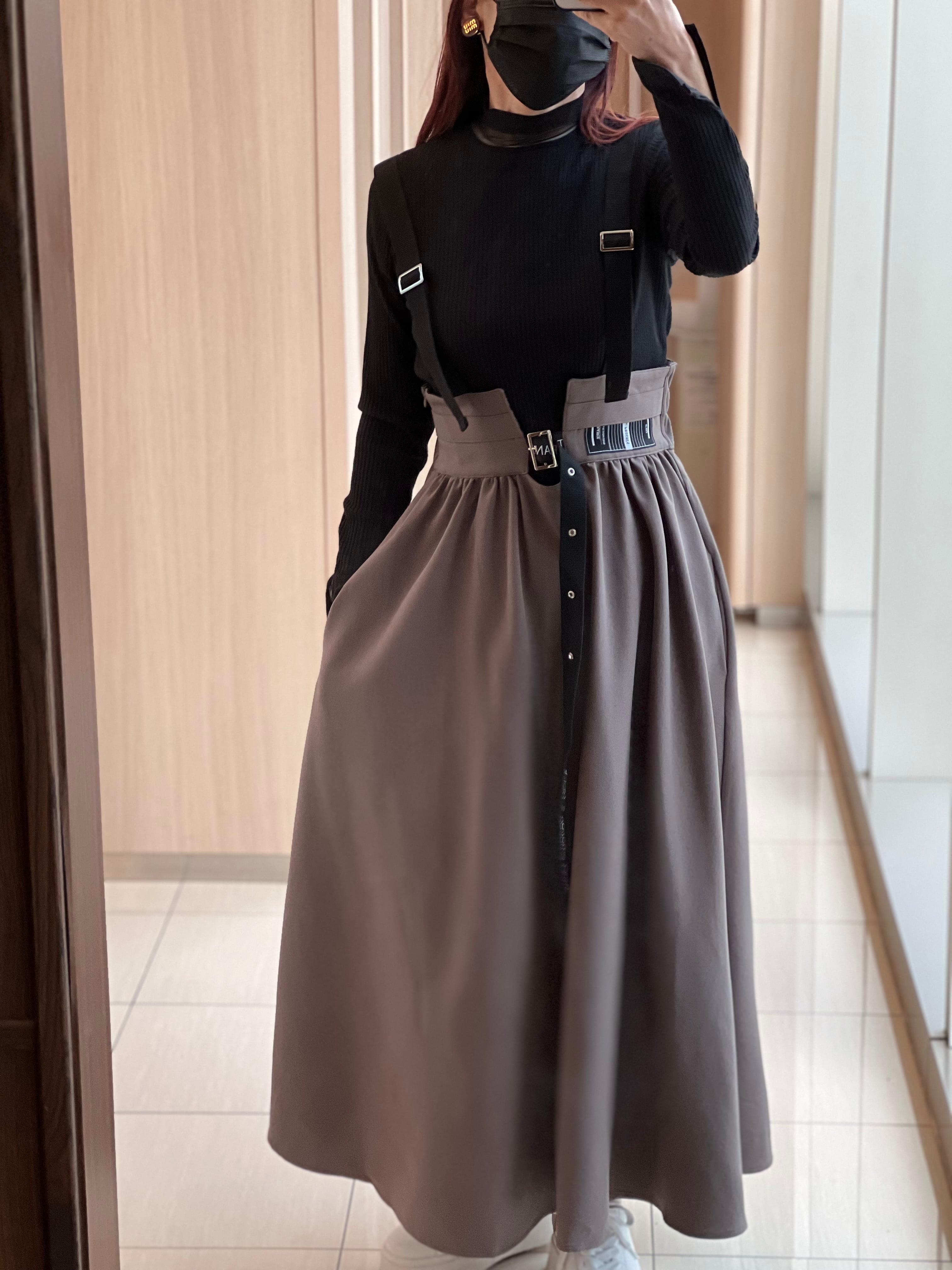 丈は肩ベルトで調整可能。ウエストは後ゴムで着用もストレスフリーの商品です♪
