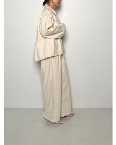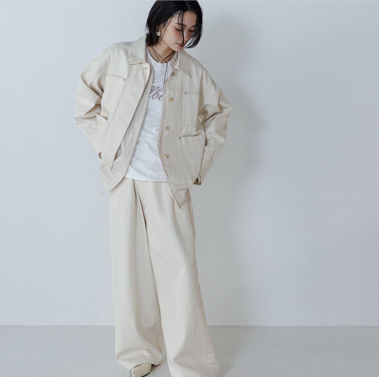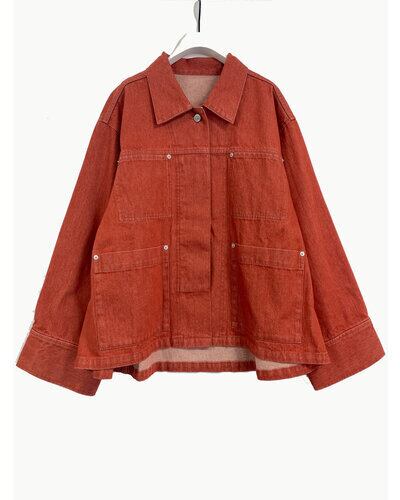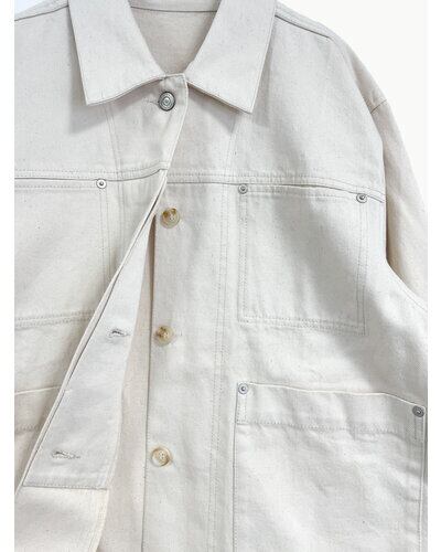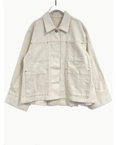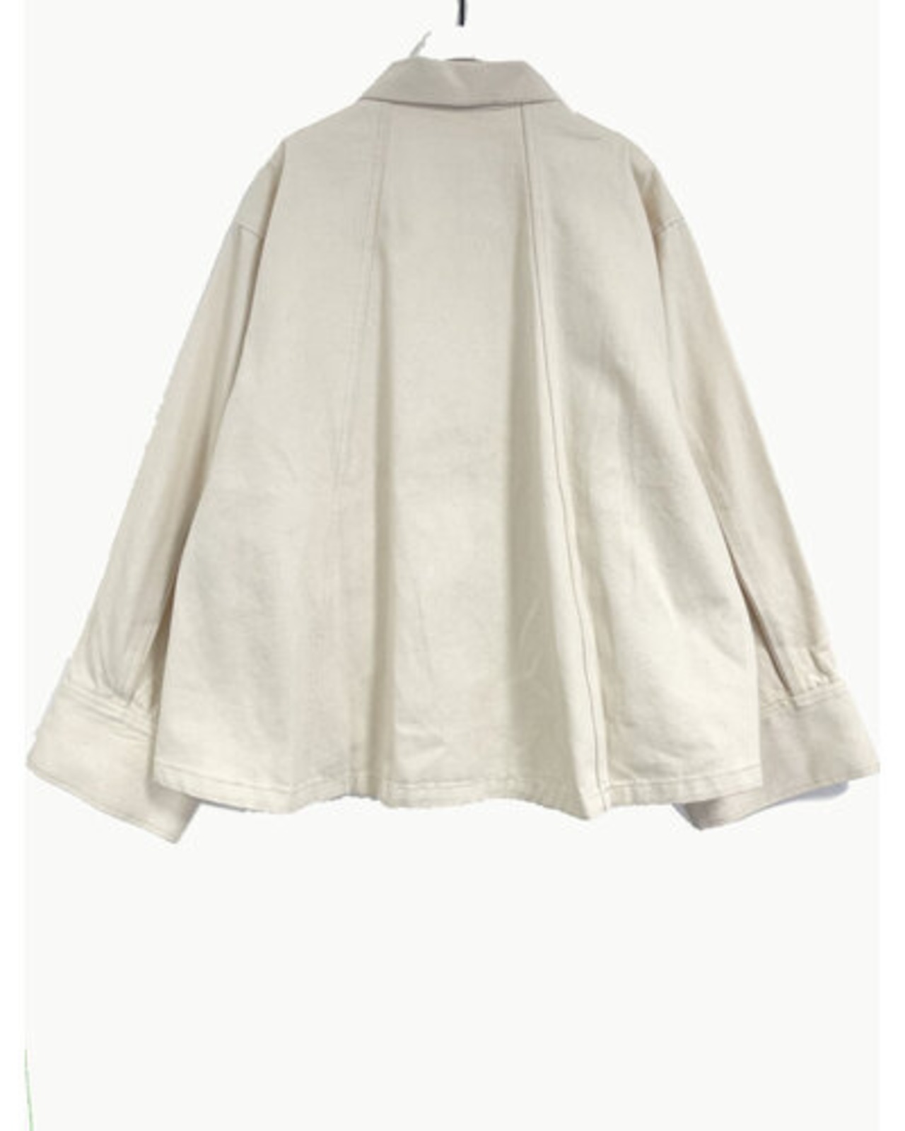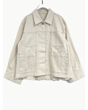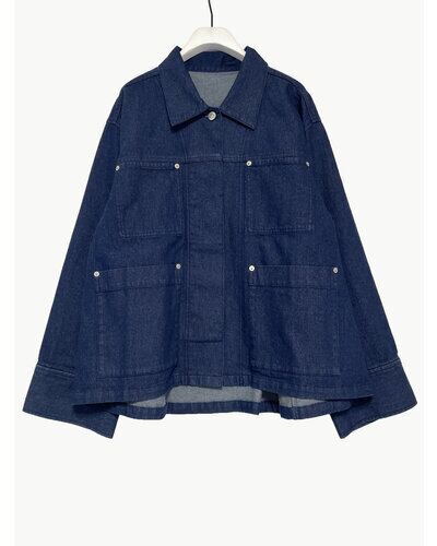 デニムのCPOジャケットです。ストーンバイオウォッシュ加工を施し適度な柔らかさと洗いによる加工感を演出しました。パターン設計で丸みとフレアシルエットで設計し、女性らしい印象に仕上げました。袖口はあえて大きめに作り、ラフに。軽アウターとしても、シャツ感覚でもご着用を楽しんでいただけます。
