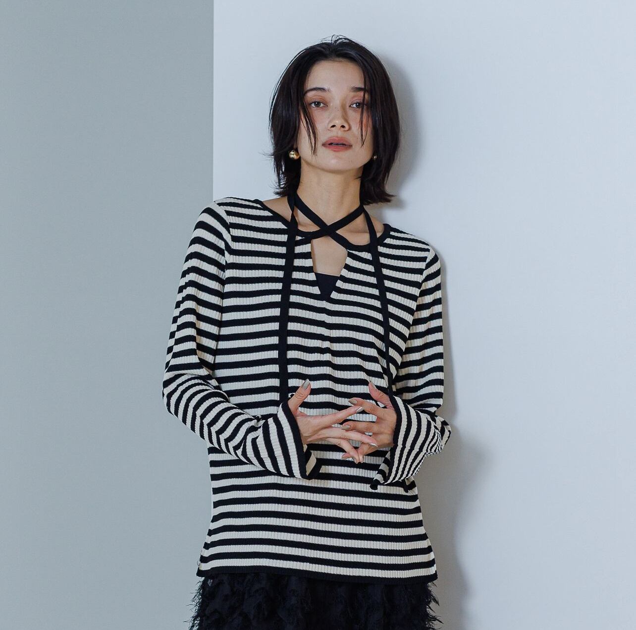 共糸のチョーカー使いが今年らしい、3WAYで着て頂けるニットプルオーバーです。