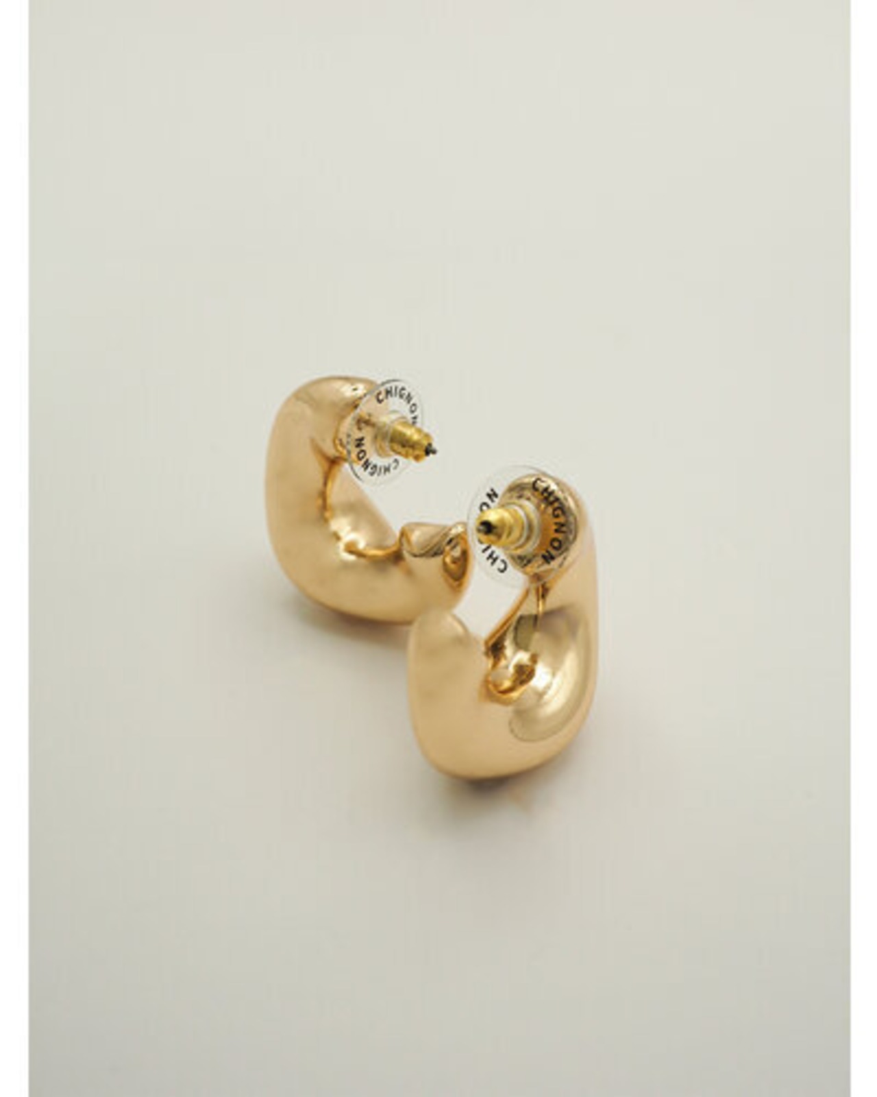 ニュアンス感のあるシルエットが特徴的なボリュームフープピアスは、軽い着け心地でストレスフリーに身に着けられます。大ぶりで程良い存在感があるので、着けるだけで耳元が一気に華やかな印象に。付属のCHIGNONオリジナルの円盤キャッチは、大きいピアスや下向きになるピアスもしっかり支えてくれるので安定感が抜群。ロゴ入りなので後ろからの見え方も◎