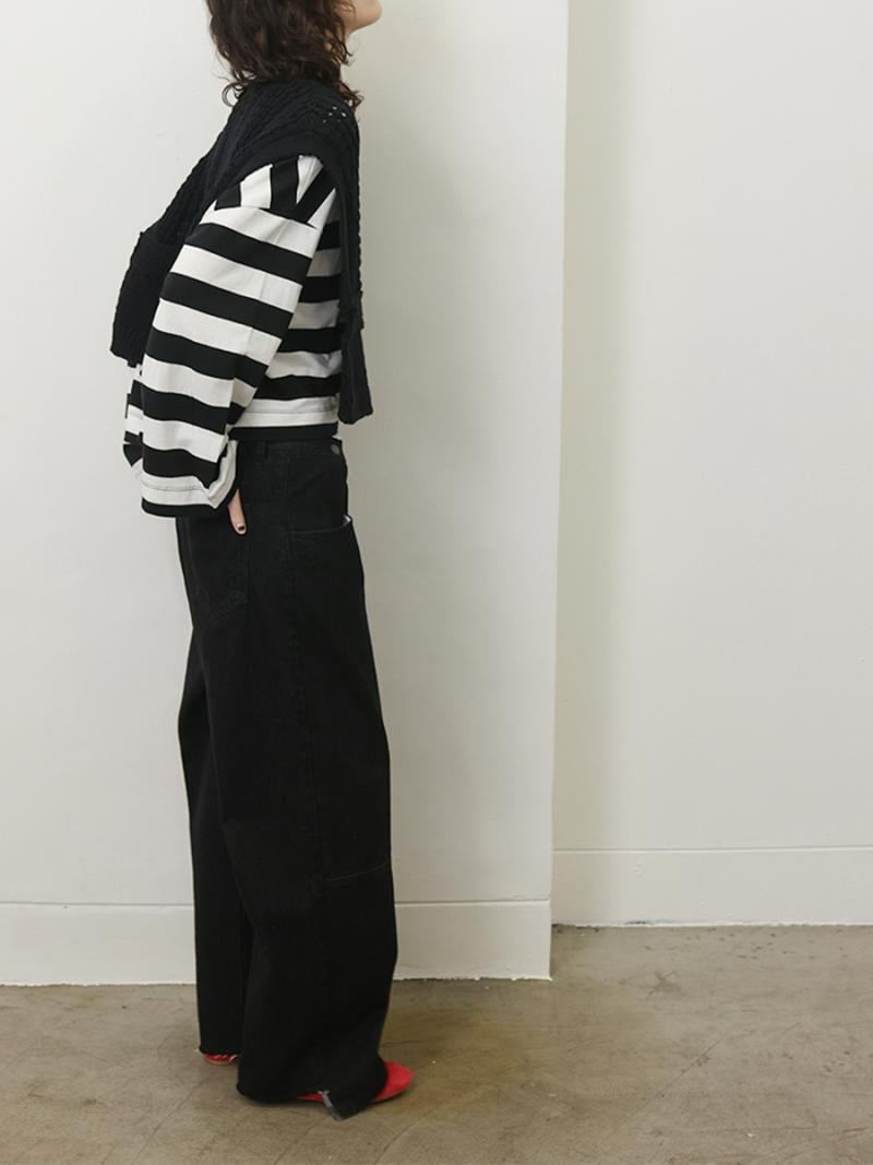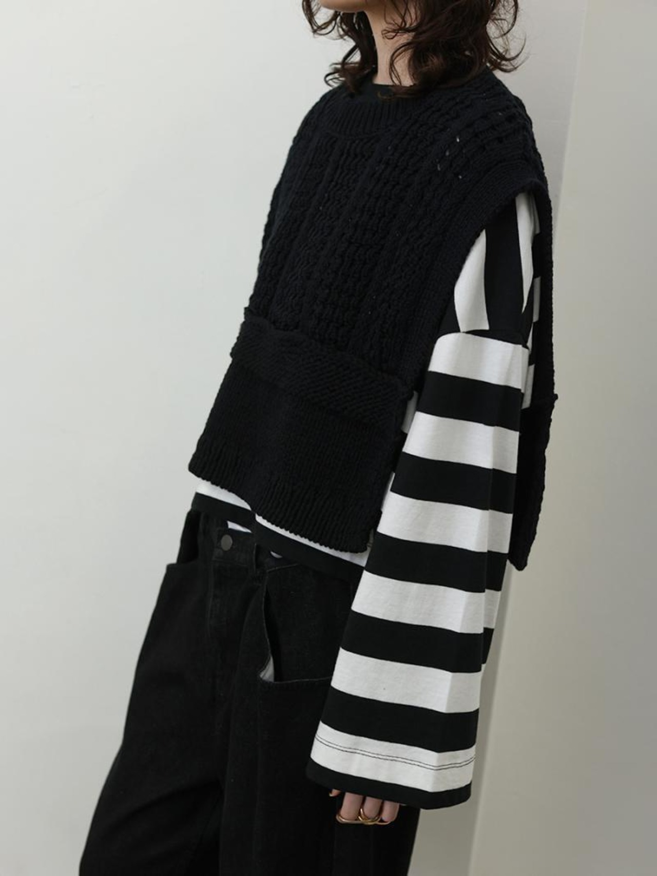 脇線が前後で繋がっていないのでインナーのアームホールやボリューム感を気にせず合わせられ、アウターの上からスヌードのように被せる着こなしもオススメです。