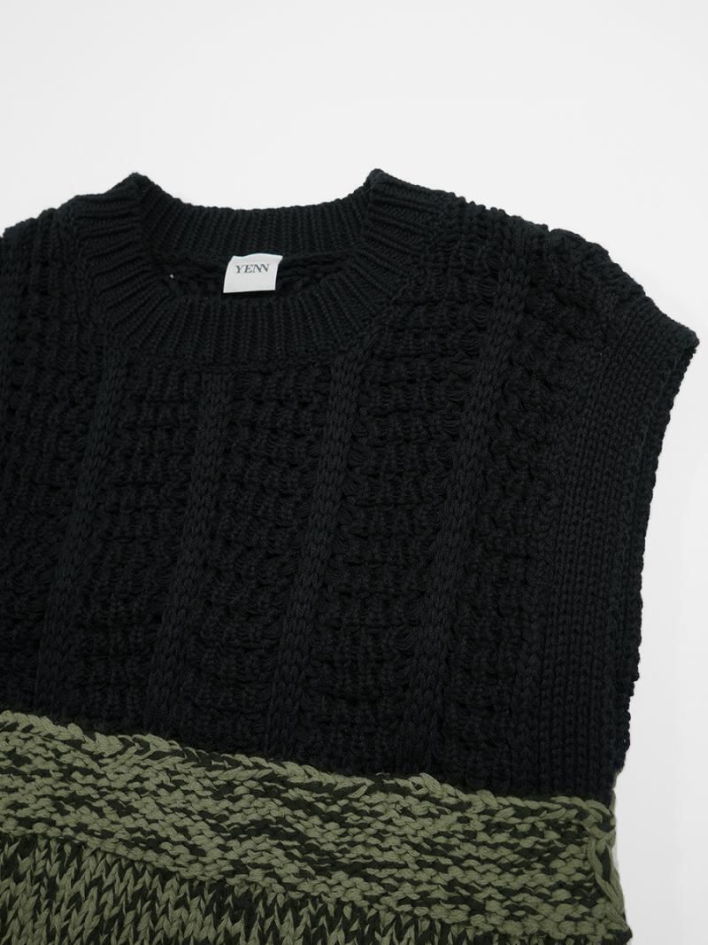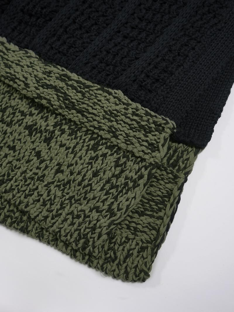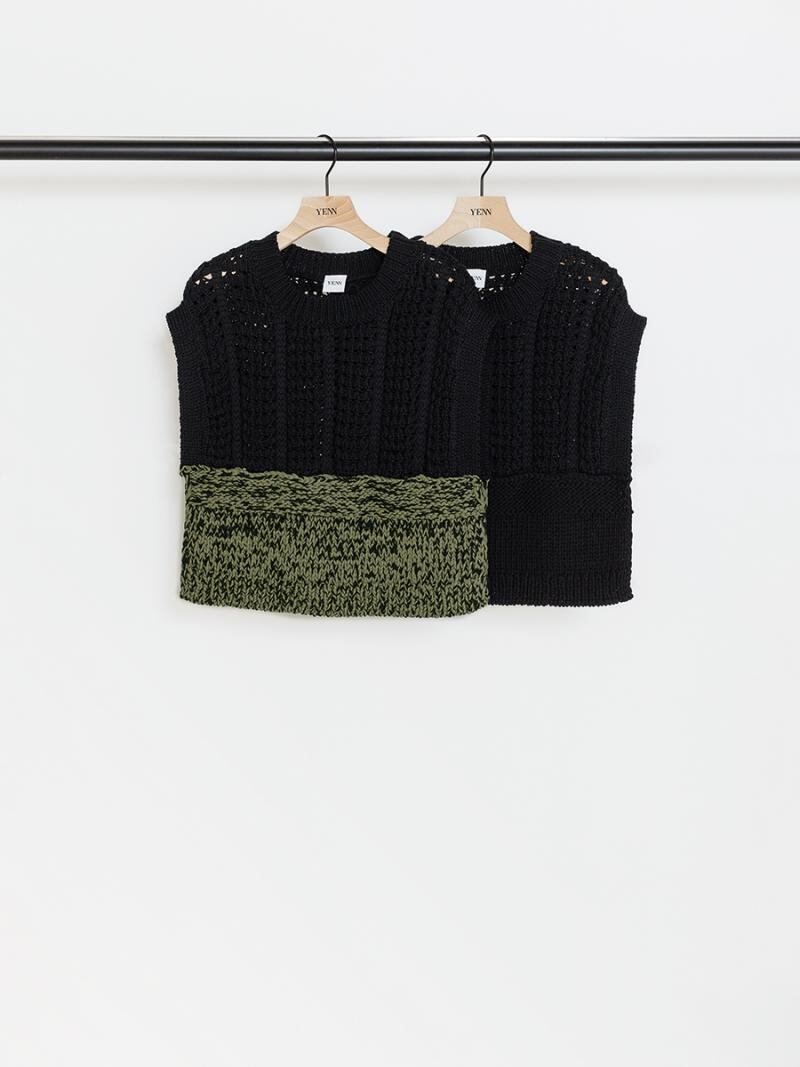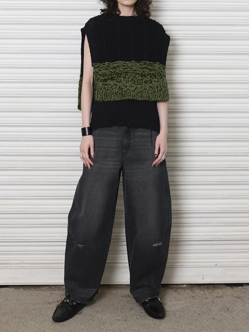 上部分はモードなブラックをチョイス。裾部分は同色のワントーンと、カーキ×ブラックの引き揃えの2色展開です。