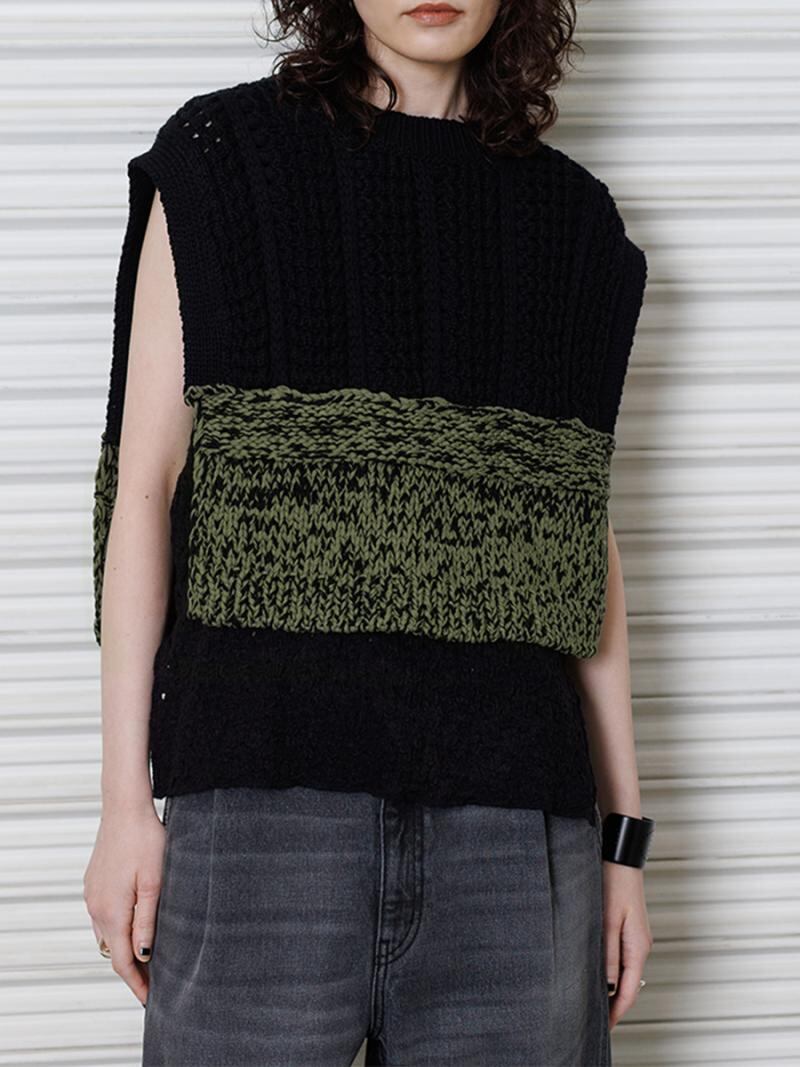ポコポコとした立体的な柄編みと、裾にローゲージの手編みを異素材コンビにして切り替えた、スクエア型のニットケープです。