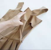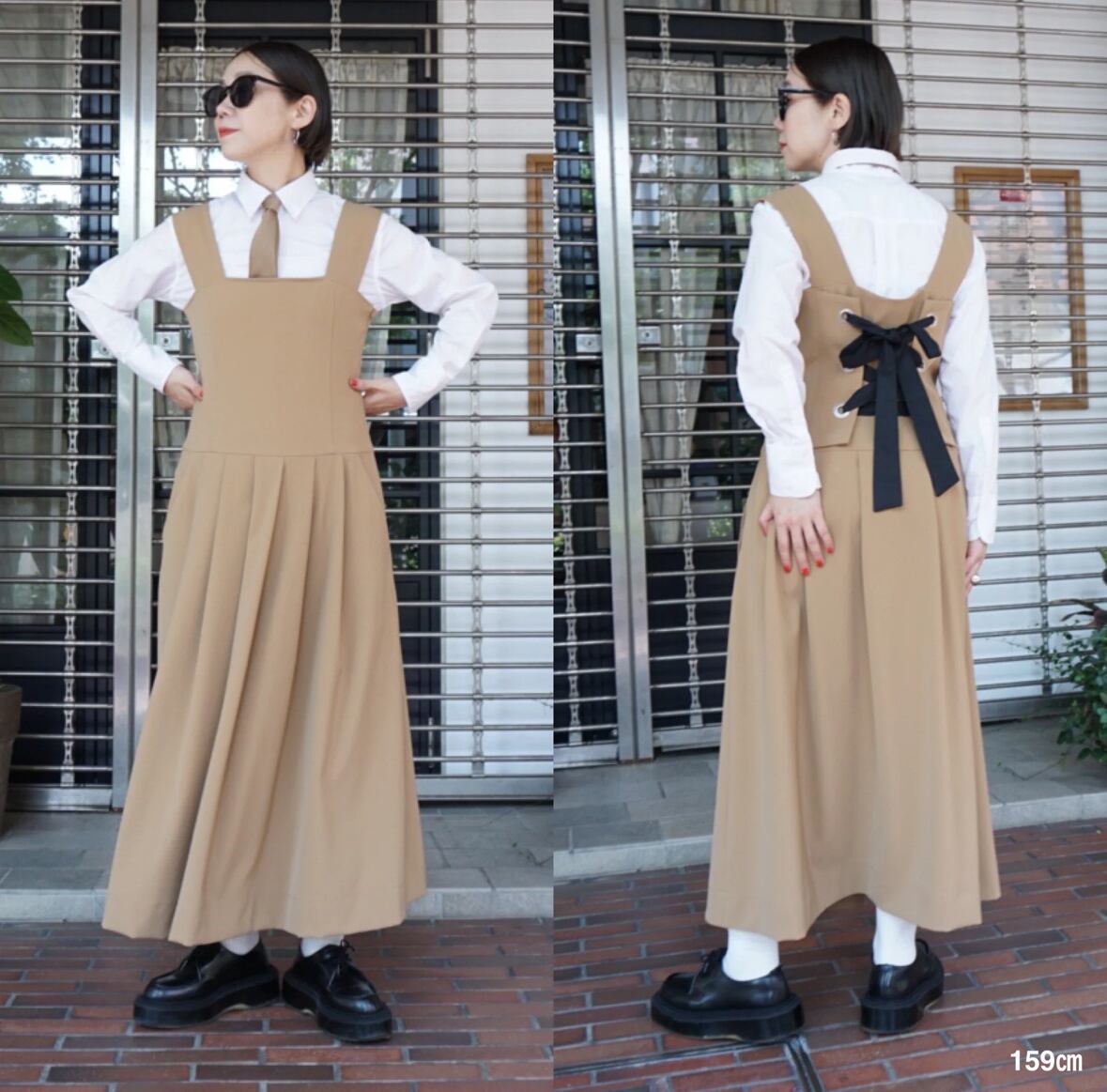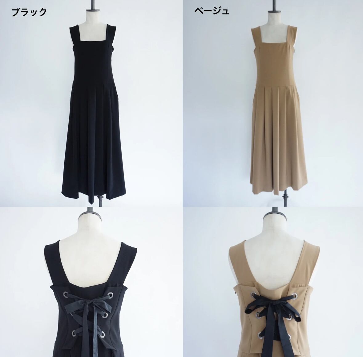 以前、出したことのあるドレスです。おそらく6年くらい前だと思います。気に入ってよく着ているのですが、お問合せが非常に多かったので今回、リピートすることにしました。素材はステファニーダブルクロスで少し重みがあり下に下がって見えてすっきりしています。シワになりにくいポリエステル素材で旅行などにも便利です。素材もお手入れがしやすいポリエステルストレッチ素材。身頃はややタイトめになっていますが、背中のリボンの編み上げで調節可能にしています。細い方にも調節ができるのでピタッとして着ることが可能です。背中にアイレットのリングをつけてリボンを付けています。後ろ姿がリボンで編み上げになっていてとてもロマンティックです。スカートはタックを深く入れています。広がりが贅沢で歩くと上品な広がりを見せます。