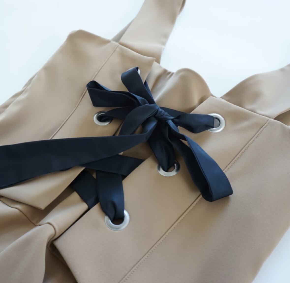 お勧めはブラック。白シャツにネクタイで合わせているルックを作っています。ベージュはキャラメルに近いカラーで優しい雰囲気。こちらも以前出したカラーに近い色味で人気でした。ベージュには背中にブラックのリボンです。