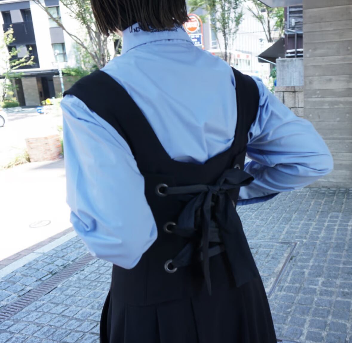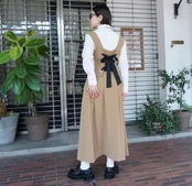丈は長めにしていてトラッドな雰囲気です。中にタイトめのカットソーやシャツを入れて着て下さい。予約受付中のシンプルなカットソーがよく合いました。または1枚でも着用が可能です。今あまりないカチッとした雰囲気が魅力かなと思います。