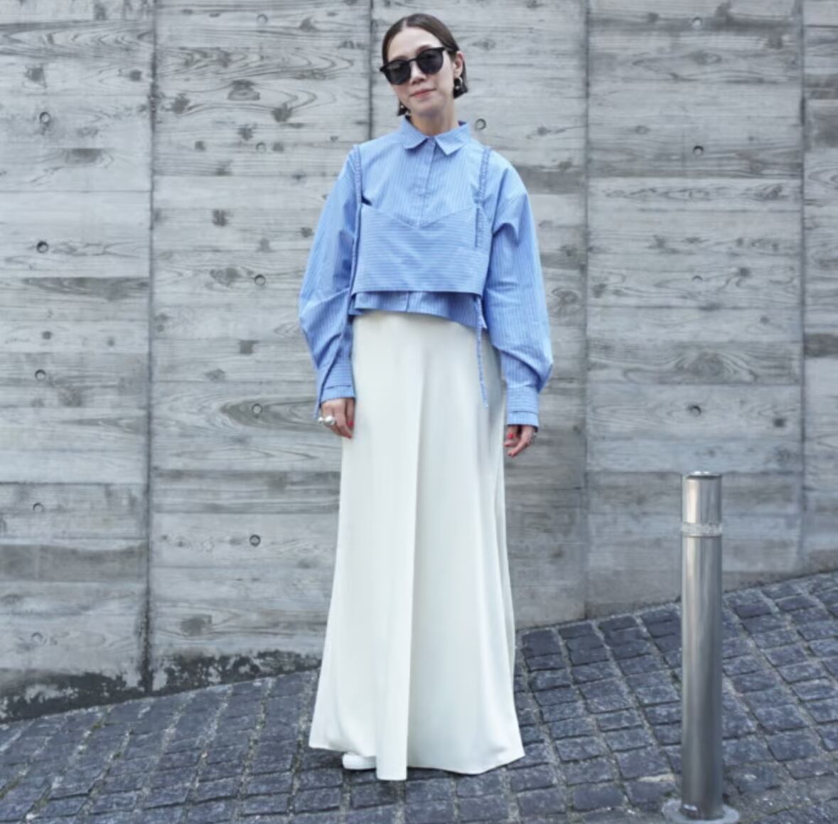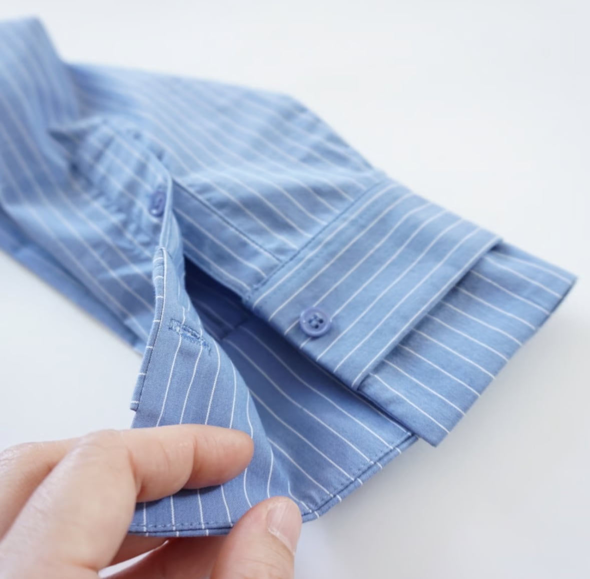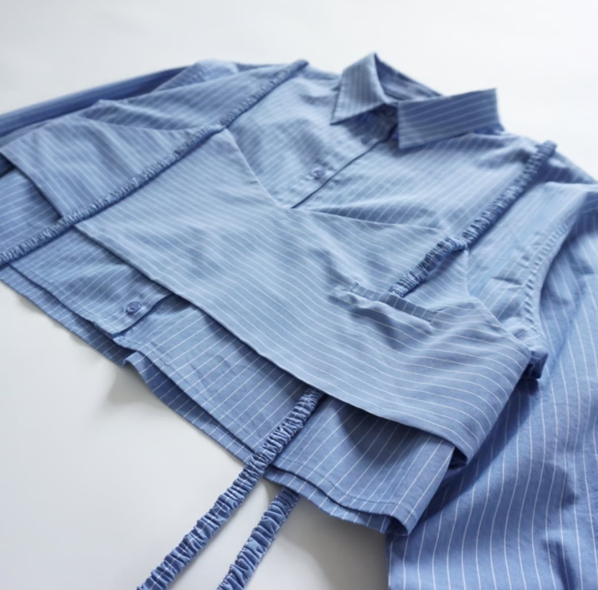 人気になりそうなホワイト無地と、ストライプのサックスカラーを展開します。ストライプは、本体のシャツがストライプ。重なるビスチェがボーダーになっています。また袖口もストライプ×ボーダーの切り替えをして少し技巧的デザインを加えてみました。大人っぽくて丁寧なカフスの作りがポイントになっています。