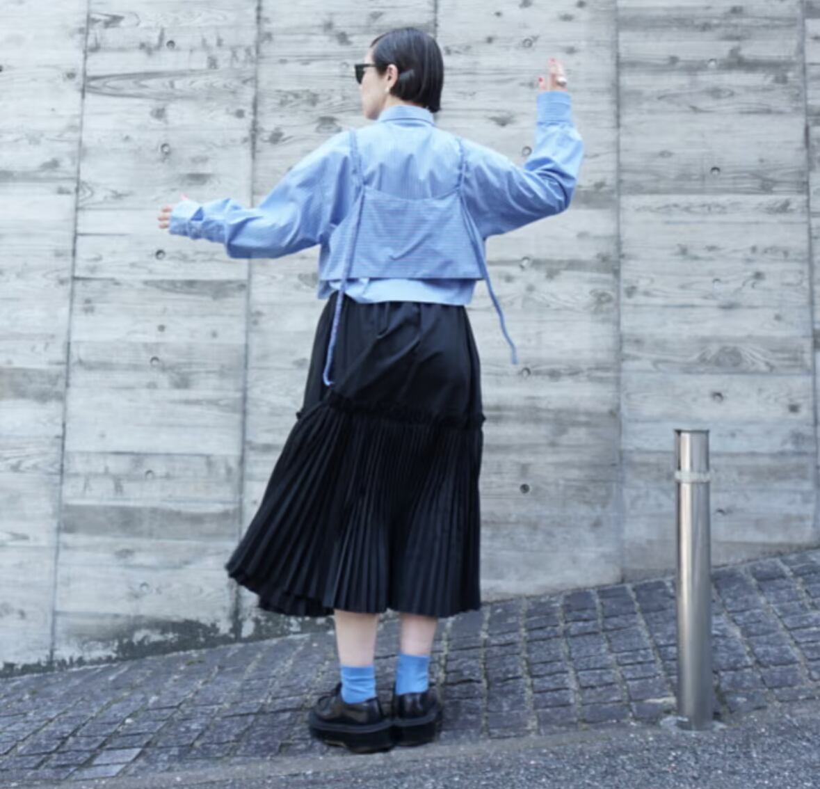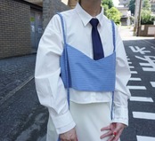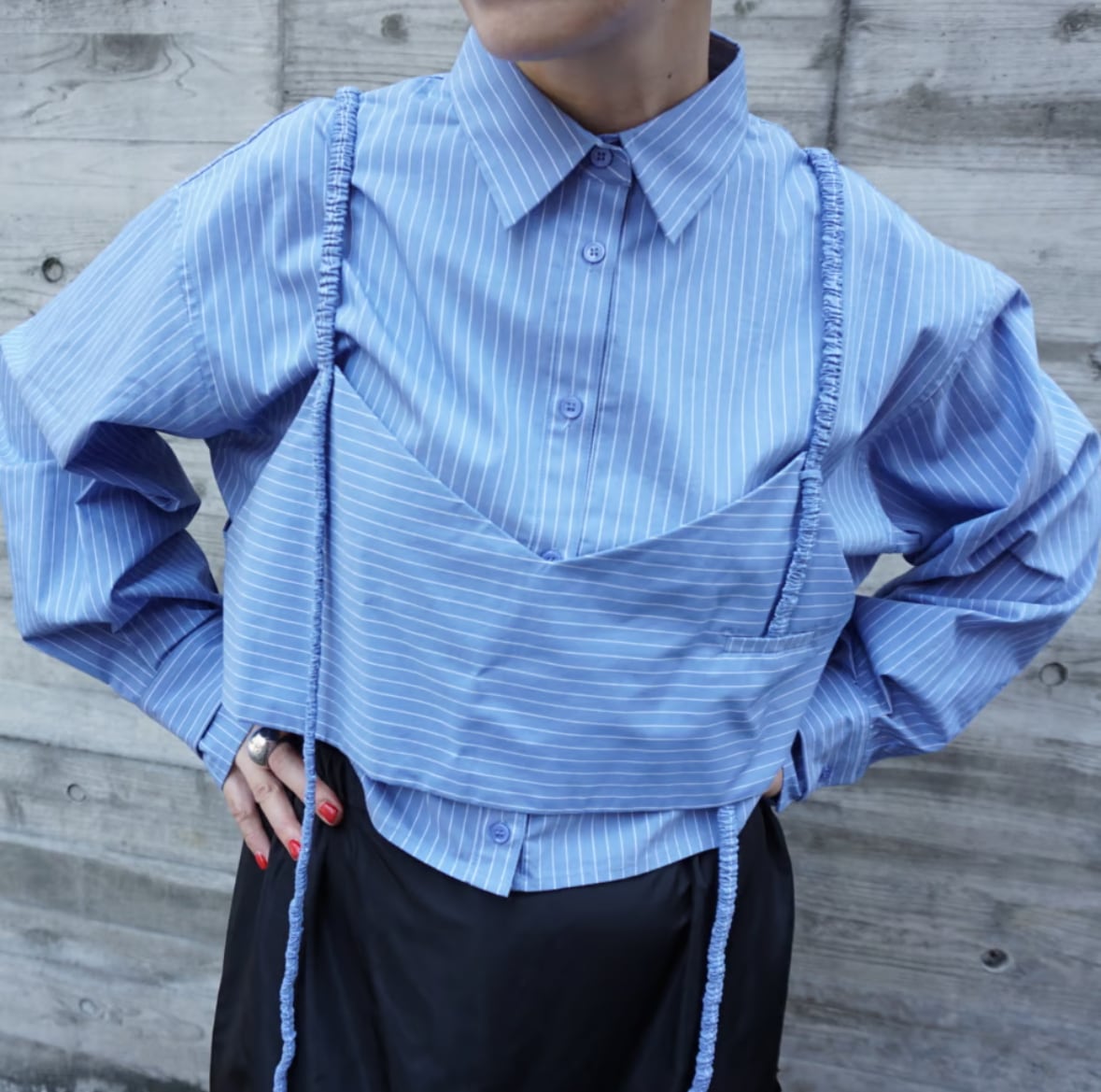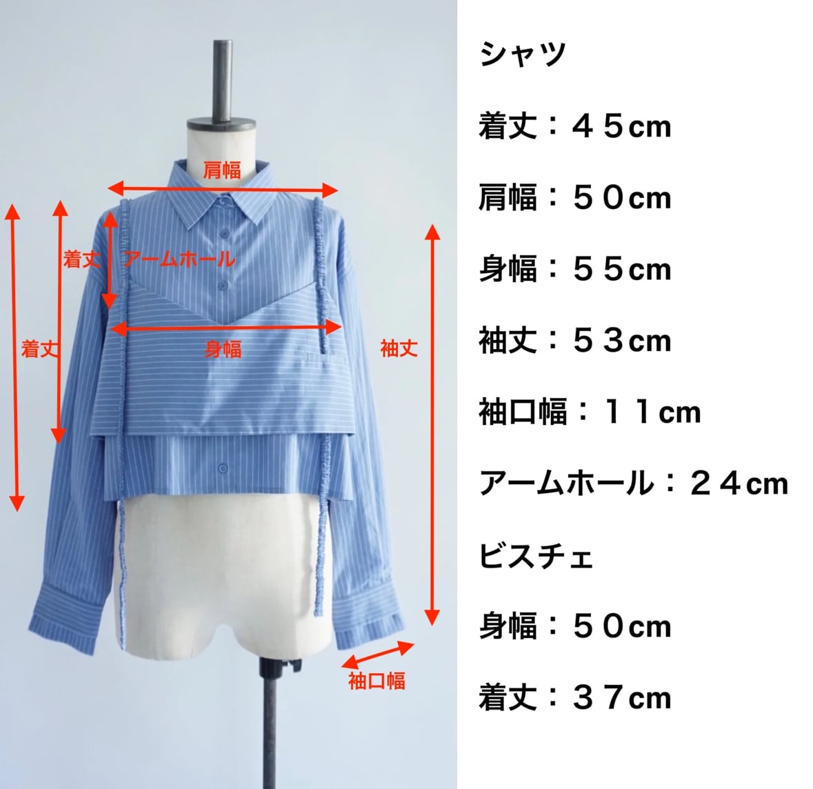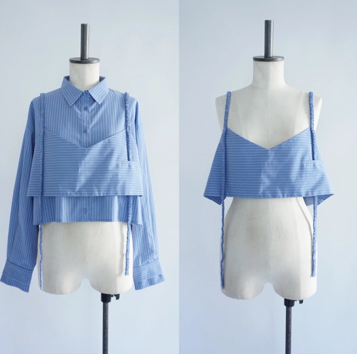 初めて出した、着丈が少しだけ短めのシャツ。重ね着で作りたくて、共生地でビスチェをデザインしました。このビスチェのデザインは安定させるのにとても苦労しました。それぞれ別々にも着ることが出来て便利です。シャツは短めですがジャストウエストよりやや下になる方が多いと思います。身頃がかなり広めにデザインしているので、短めに見えますが、実際は短すぎる事はありません。身頃はかなりワイドなので、体型は選びません。袖も少し長めにして、身長の高低があってもどなたでもしっくりくるようにしています。最近流行している着丈の短めのシャツを大人っぽく、丁寧に作っています。抵抗のある方はインナーに長めのTシャツなどを入れて着てもOK。レイヤードは、ビスチェを中に入れて重ね着も良いかと思います。ビスチェだけ別のシャツやTシャツに合わせても使える1つで2役できる今回遊びのあるアイテムになっています。ビスチェの肩紐は中にゴムを入れてシャーリング。肩からズレにくくしました。もう少し肩紐が内側に入るようにパターンの調整を考えています。