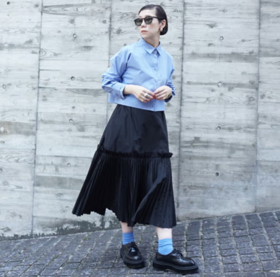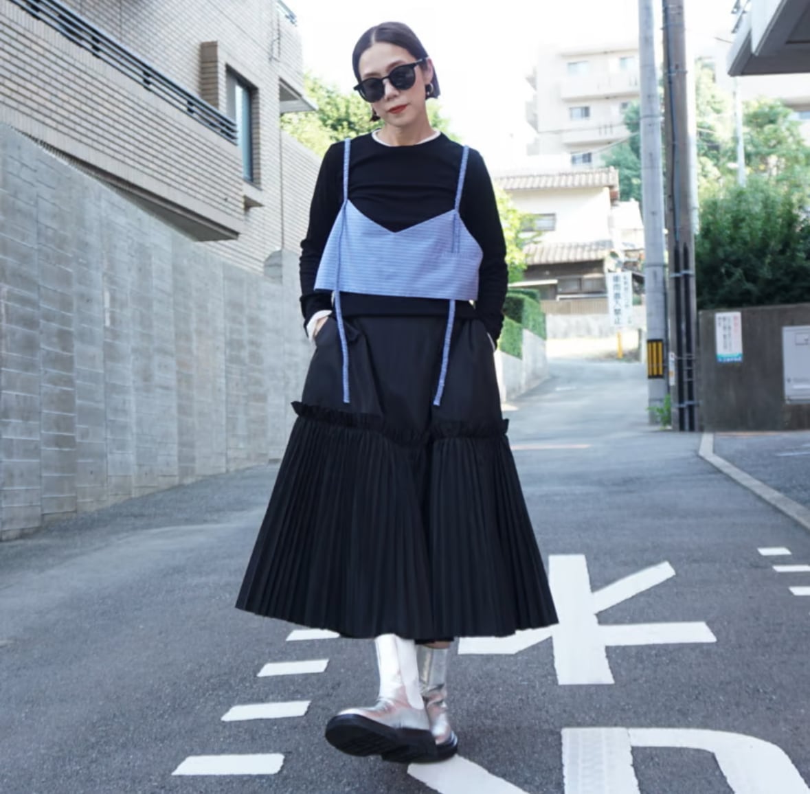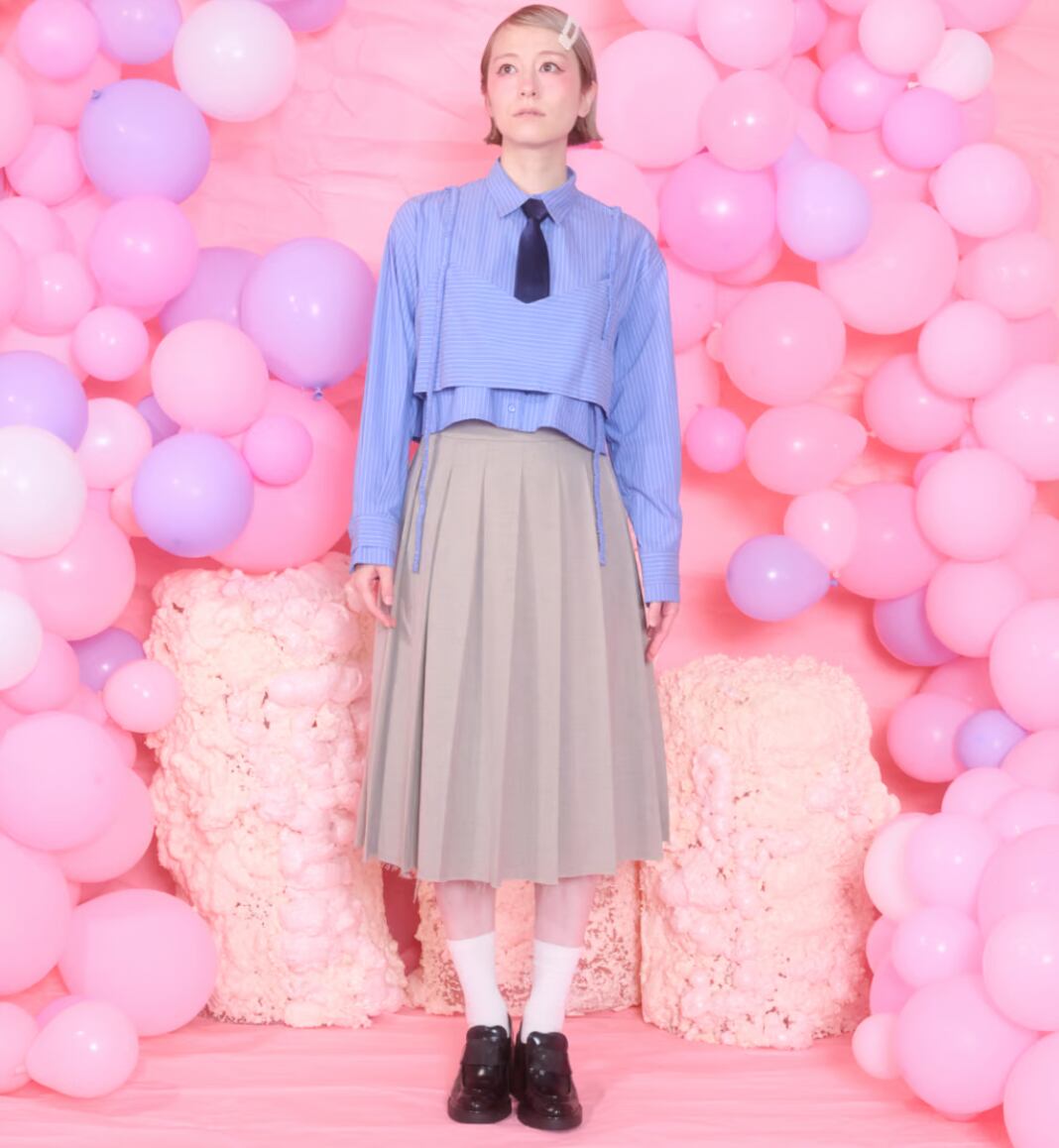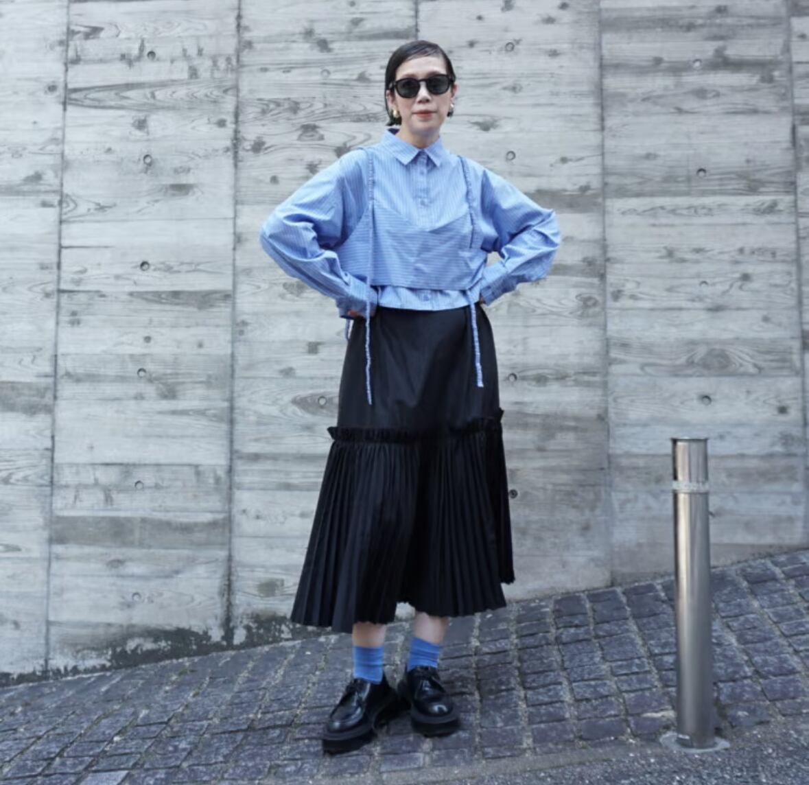 初めて出した、着丈が少しだけ短めのシャツ。重ね着で作りたくて、共生地でビスチェをデザインしました。このビスチェのデザインは安定させるのにとても苦労しました。それぞれ別々にも着ることが出来て便利です。シャツは短めですがジャストウエストよりやや下になる方が多いと思います。身頃がかなり広めにデザインしているので、短めに見えますが、実際は短すぎる事はありません。身頃はかなりワイドなので、体型は選びません。袖も少し長めにして、身長の高低があってもどなたでもしっくりくるようにしています。最近流行している着丈の短めのシャツを大人っぽく、丁寧に作っています。抵抗のある方はインナーに長めのTシャツなどを入れて着てもOK。レイヤードは、ビスチェを中に入れて重ね着も良いかと思います。ビスチェだけ別のシャツやTシャツに合わせても使える1つで2役できる今回遊びのあるアイテムになっています。ビスチェの肩紐は中にゴムを入れてシャーリング。肩からズレにくくしました。もう少し肩紐が内側に入るようにパターンの調整を考えています。