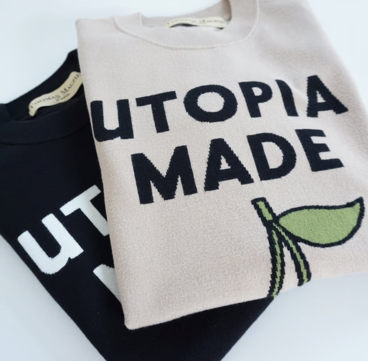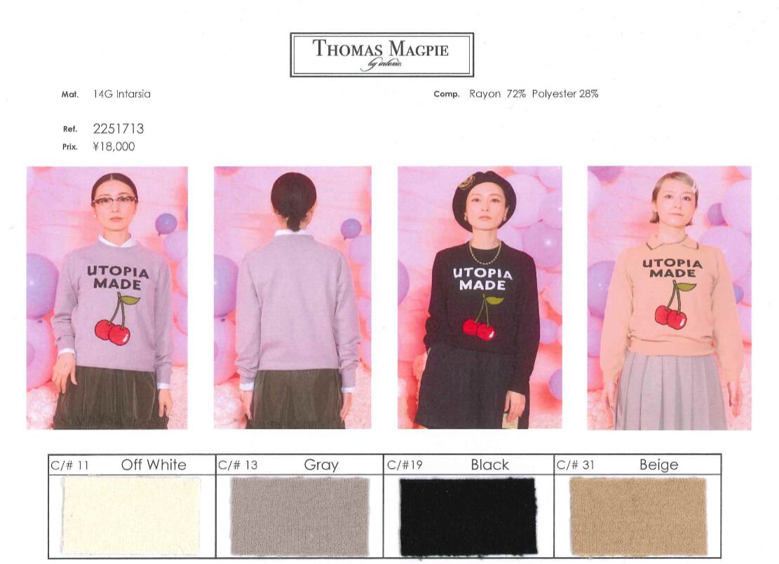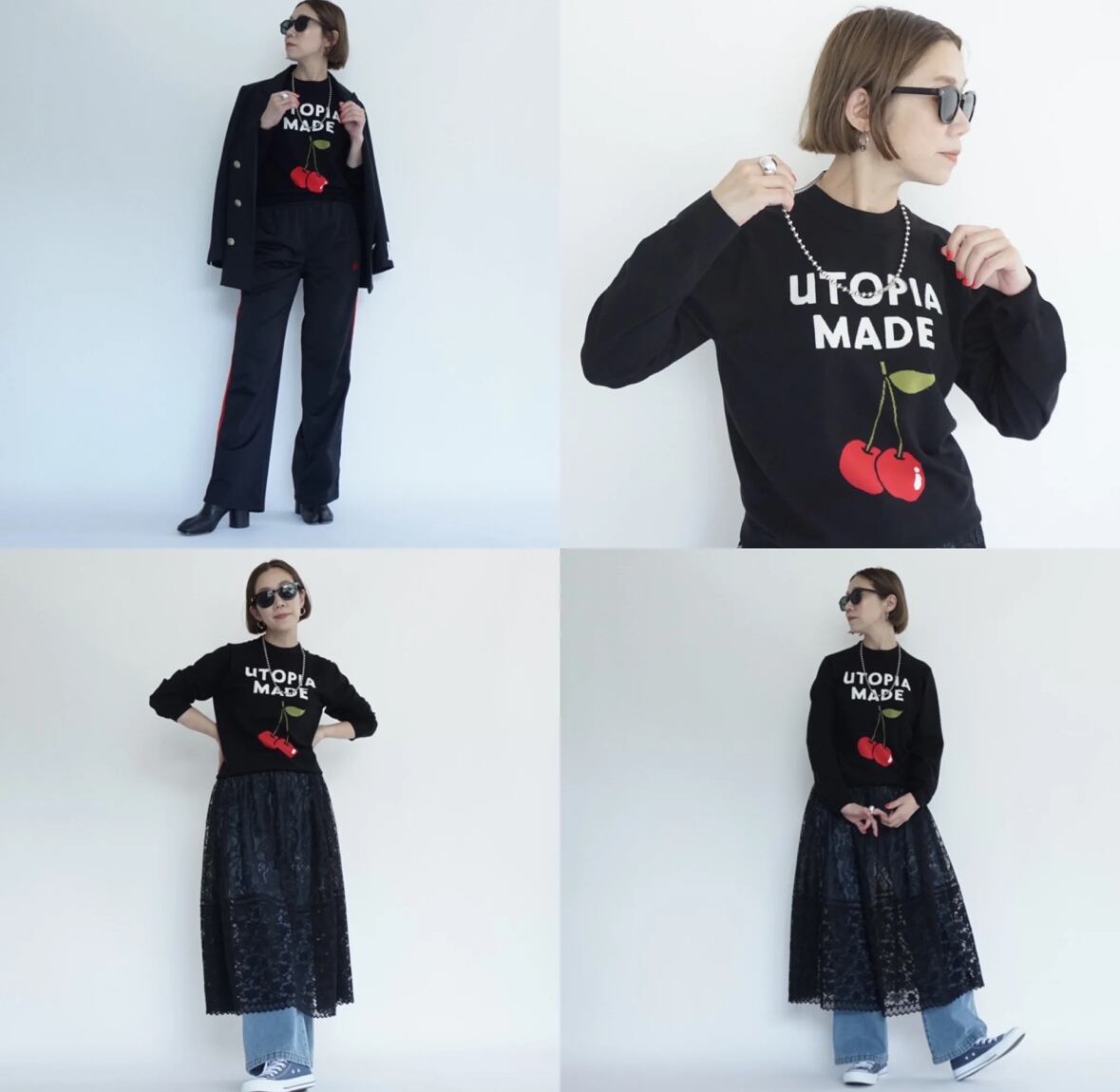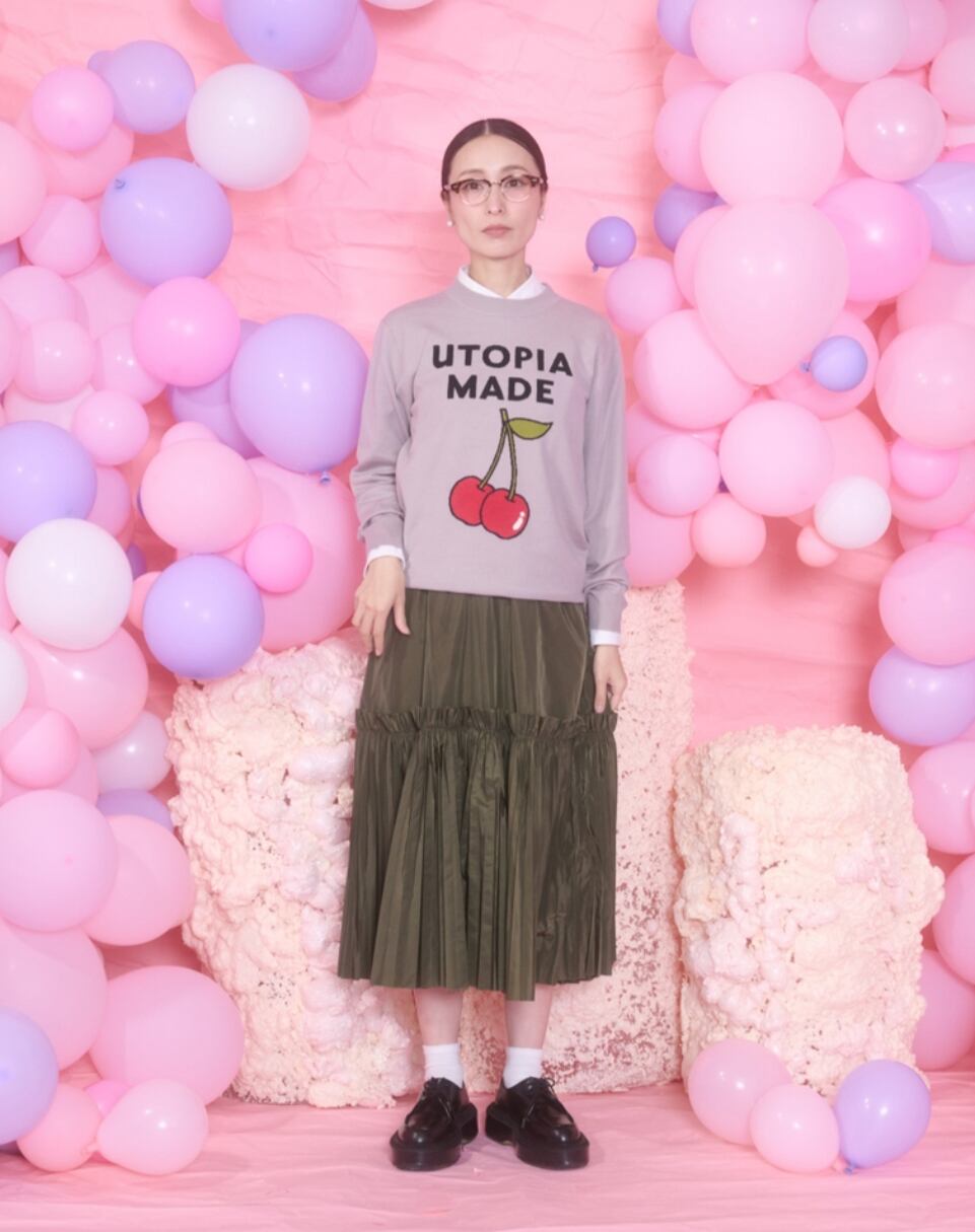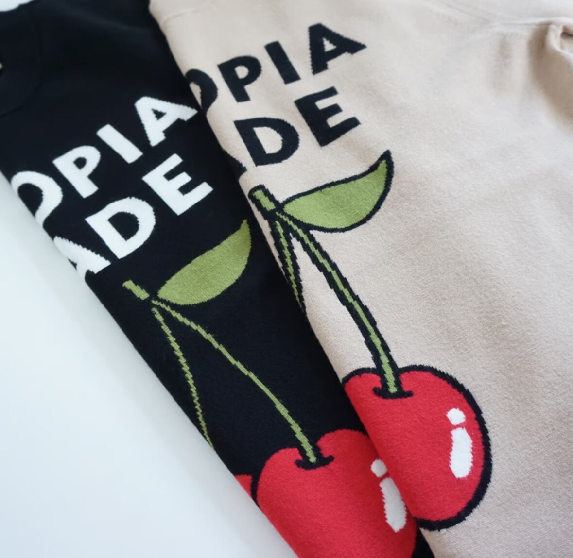 ユートピアで作られたチェリーの絵を描いて入れています。今回のユートピアのイメージは理想郷に入っていきたい、ストレスのない世界なんてないだろうけれどもそんな世界が未来にできたらいいな、という思いからこの言葉を選んでいます。トマスモアのユートピアが16世紀に一番最初に出版され、この言葉が初めて使われました。それはおそらく歴史の授業で知った言葉でした。私なりのユートピアのイメージは今回のコレクションのメインビジュアルになっています。ふわふわとした心地よい世界。イメージを伝えカメラマンとモデルに写真で表現してもらいました。ユートピアでできたチェリーはとても美味しい。このさくらんぼはユートピアでできたものです。さくらんぼの花言葉は”良心”です。心の声に耳を傾け、誠実に行動する精神、善良な教育、上品さ、幼いピュアな心、というものがあるそうです。みんなが良心という心で人々に接することができれば世界はきっと心地よいものになるのだろうな、なかなか出来はしないけど。という理想を表現しています。また現実的にはきっと出来ない、でも精神の世界で理想郷に入れたらいいな、という私自身の妄想でもあります。ベージュとブラックの2色展開。私はブラックがお勧めです。