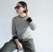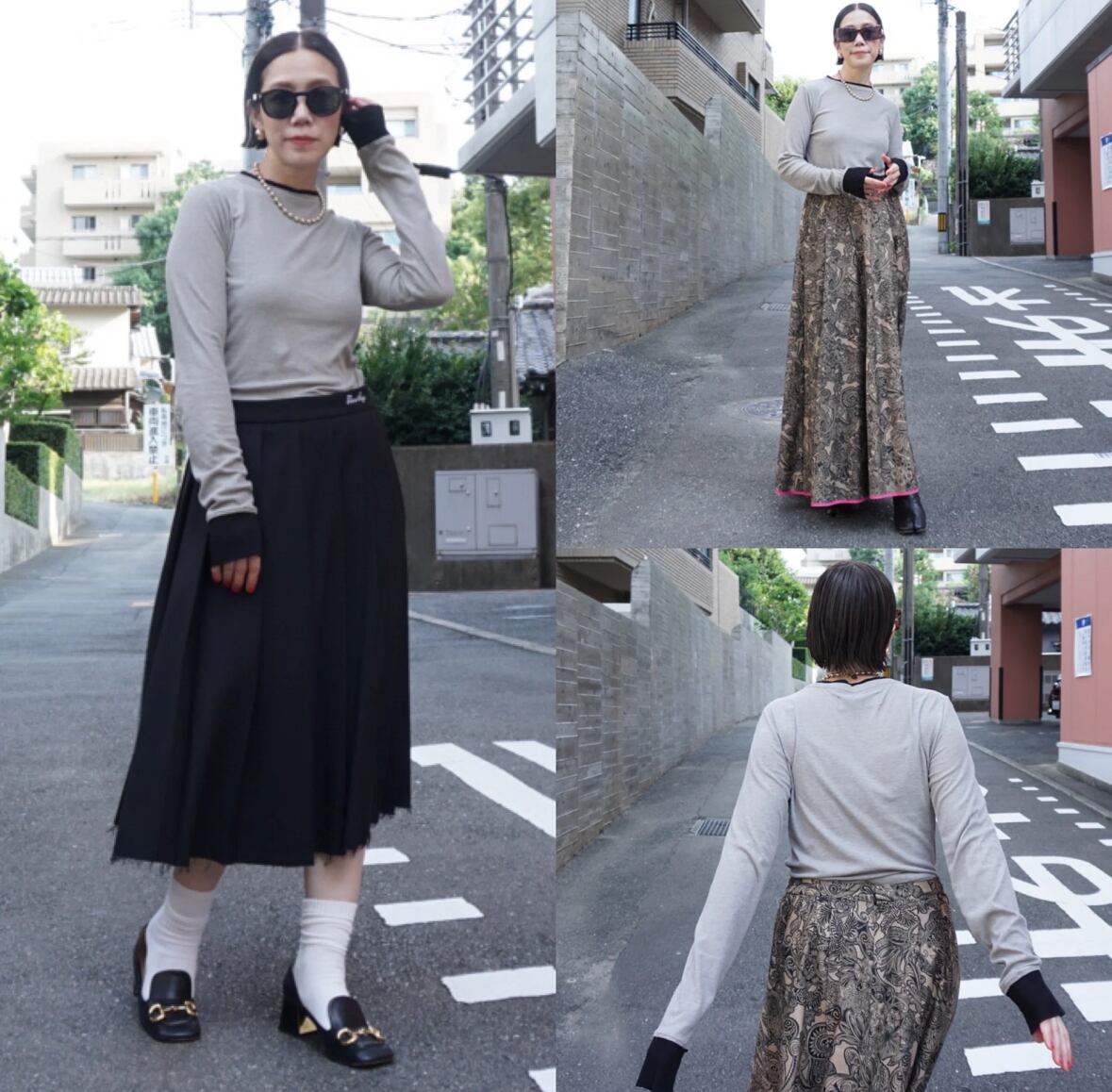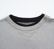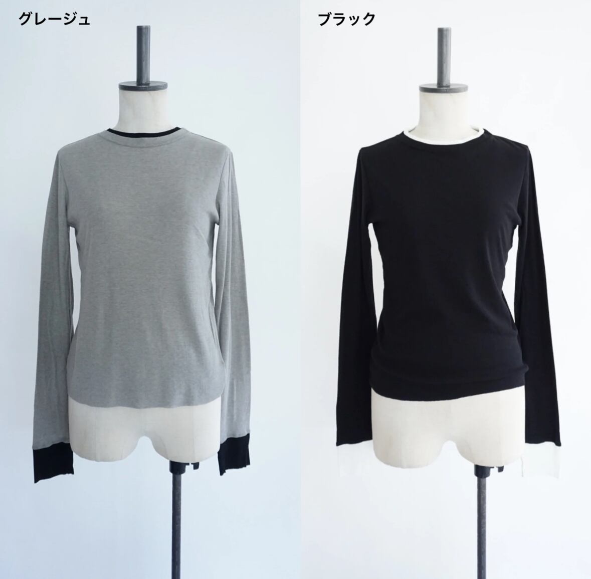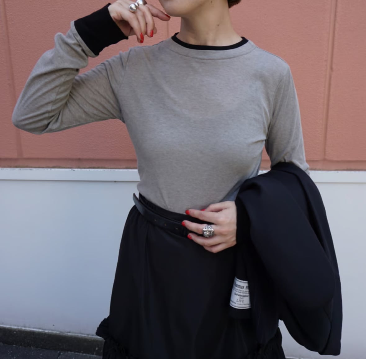 糸は強度が出るようにガス焼き加工というものを施した双糸なので、より肌触り良いタッチになっています。長袖ながら涼しく着る事ができます。コンパクトに見えますが、ピタピタにはならず、ほどよいゆとりがあり、伸縮性の高いカットソーです。肌触りでこの素材を選びました。袖口と襟ぐりはカットソーを重ねて着ているように見えます。トレンドも少し意識しています。冬場のインナーとしても使えます。袖はかなり長めにしました。何にでも合わせられるクルーネックで非常に使い勝手の良いインナーです。グレージュは少し透け感があります。そろそろオーバーサイズだけではなく細身に見えるインナーもコーディネートに取り入れたいと思いデザインしました。2枚購入したいくらいお気に入りです。今回、どんなお洋服にも合わせられて、サイズを気にせずに着られるので、本当にお勧めです。ひとまずお勧めはブラックですが、グレージュもあると便利です。私もこれまでに出していない春用のインナーで、かなり使えると思うので2枚買いを検討中です。