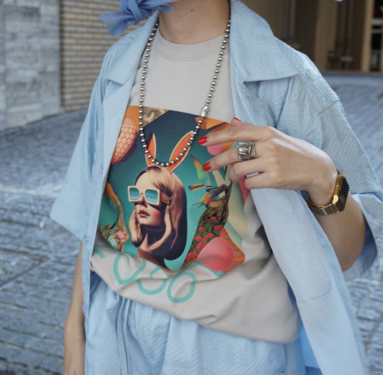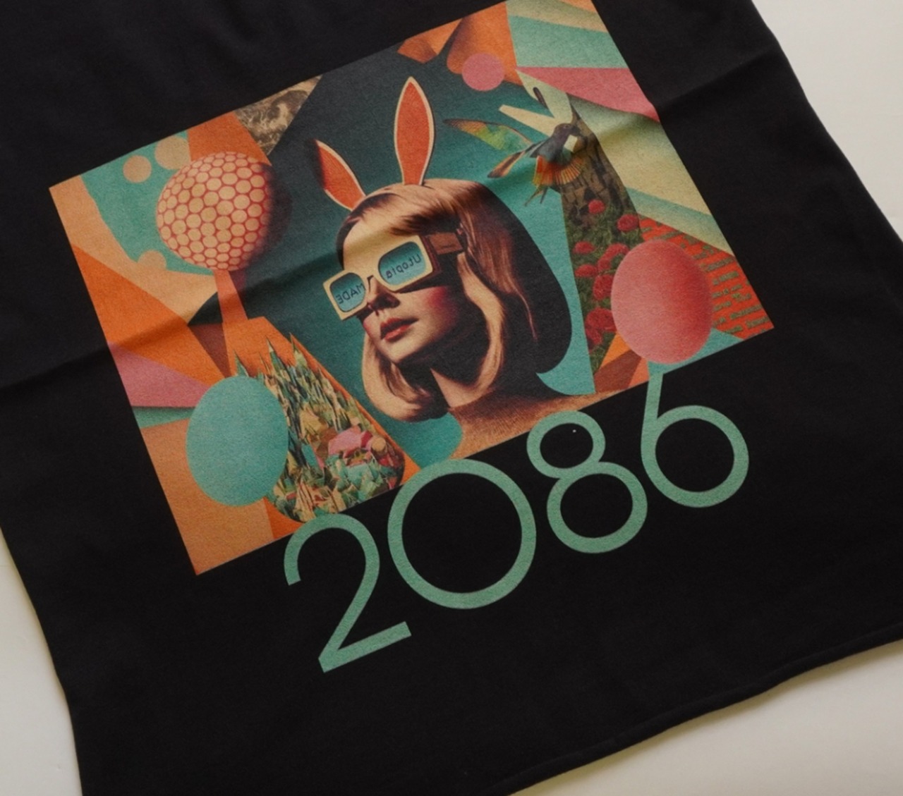 これまでには作っていないタイプの絵をモチーフに女の子がユートピアを想像してその空想の中に入り込んでいるイメージです。彼女はとても幸福そうに楽しそうにサングラス越しにその世界のことを考えています。このグラフィックの世界観からビジュアルもイメージを作り、他のアイテムもなんとなくパステル調にして今回のアイテムをまとめています。