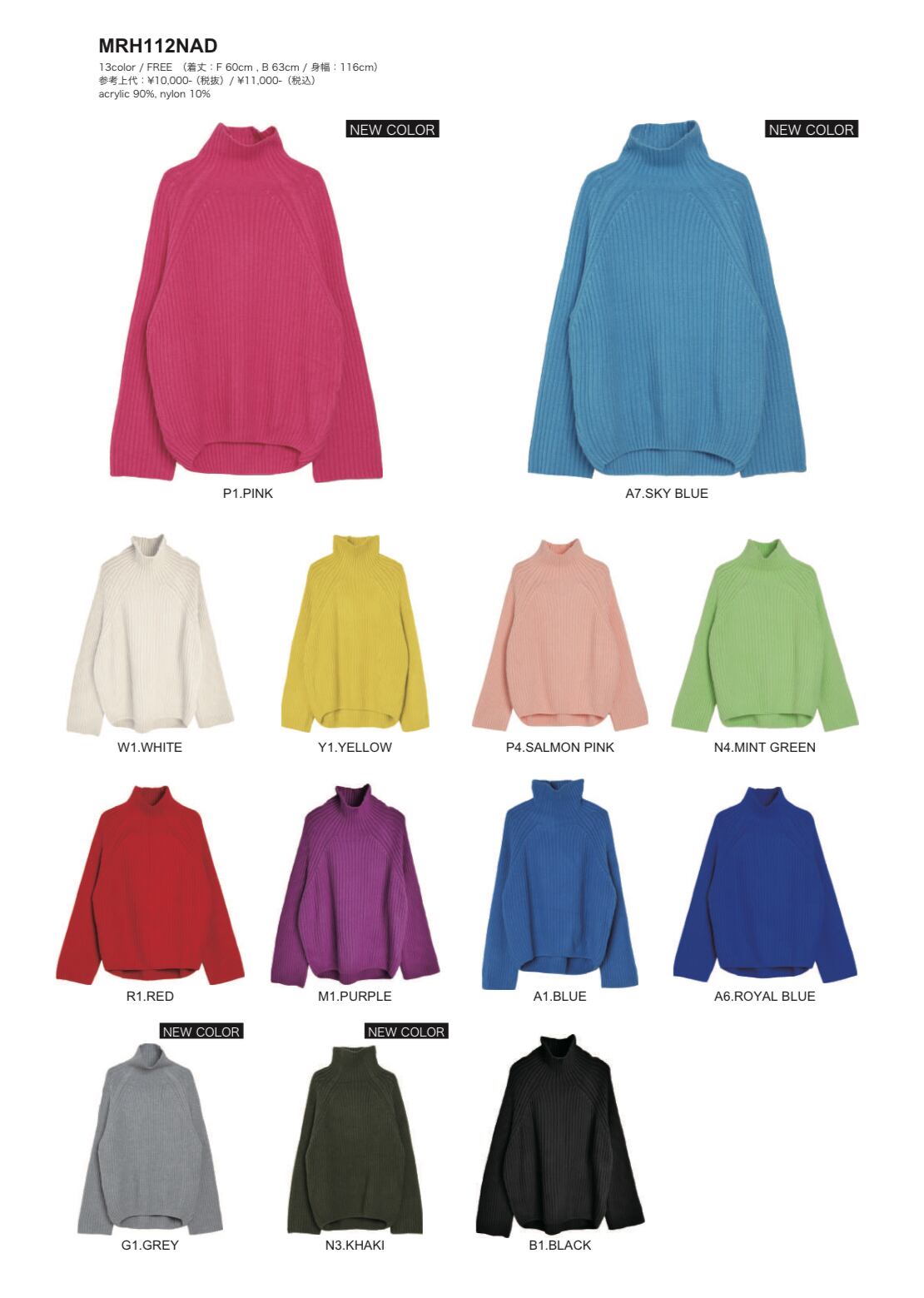 color P1.PINK/A7.SKY BLUE/W1.WHITE/Y1.YELLOW/P4.SALMON PINK/N4.MINT GREEN/R1.RED/M1.PURPLE/A1.BLUE/A6.ROYAL BLUE/G1.GREY/N3.KHAKI/B1.BLACK