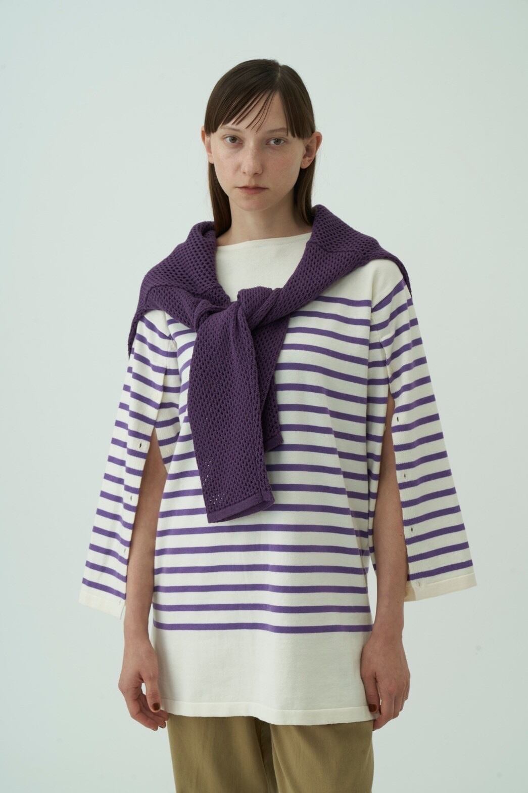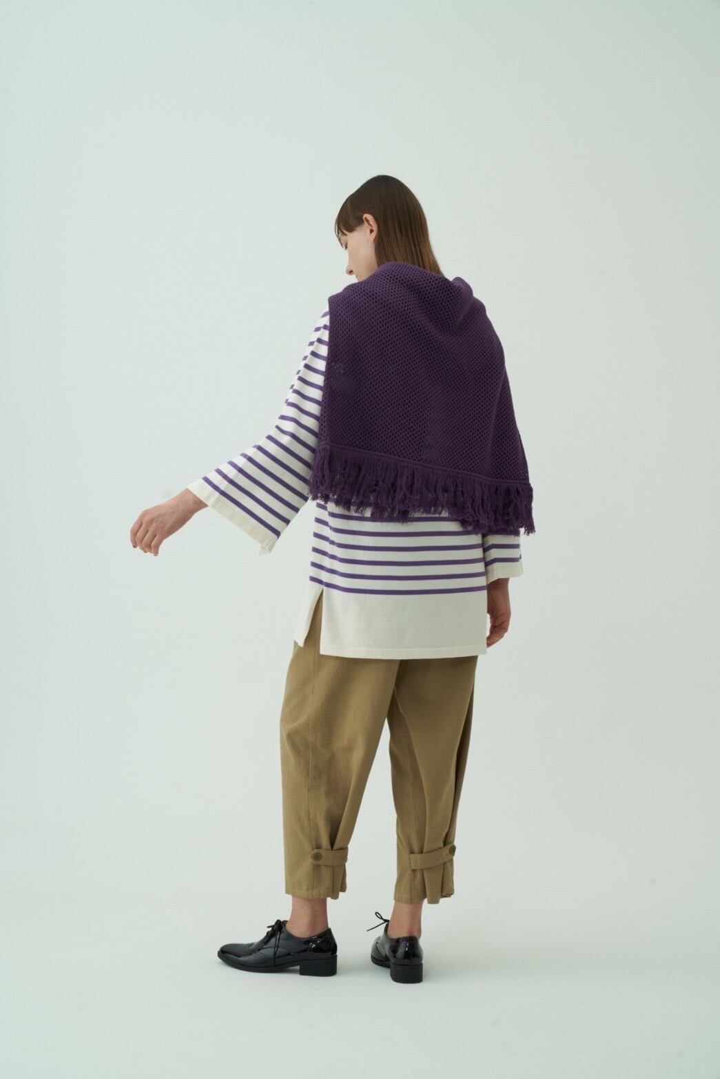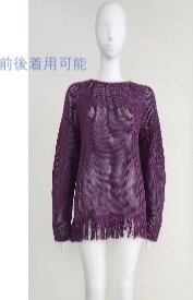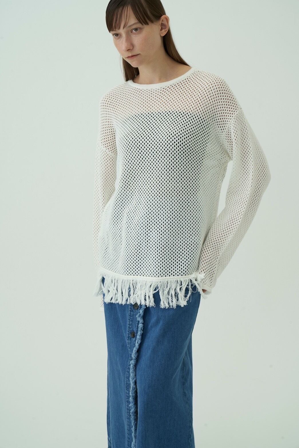20/2のコットン糸を使用して、アゲージのメッシュ風にみ上げたニット素材です。街には同じ糸でフリンジのディテールが施されています。