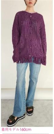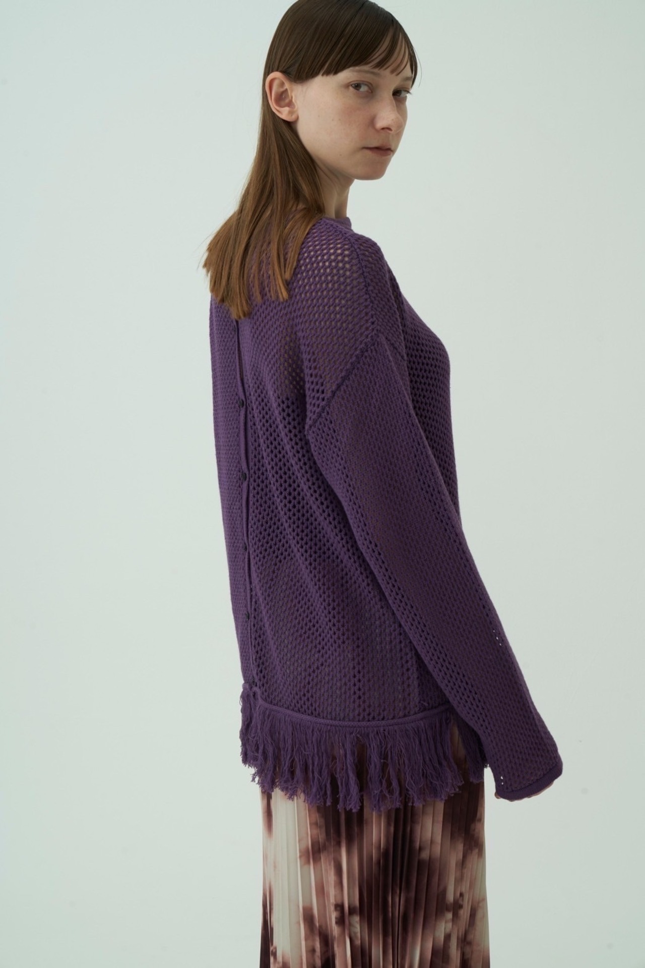 福にフリンジがあしらわれたメッシュの2WAYカーディガンです。軽やかなメッシュ素材が通気性と快適さを提供し、フリンジのディテールがデザインにアクセントを加えています。カーディガンとしてもブルオーバーとしても着こなせる2WAY仕様で、春夏のレイヤードスタイルに最適なアイテムです。
