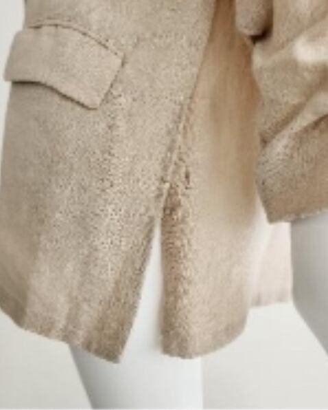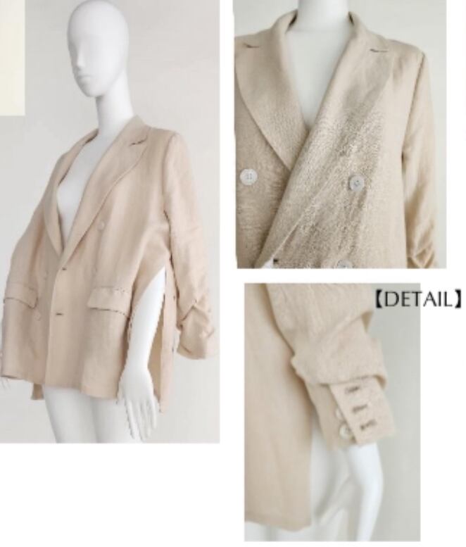 ボクシーで抜け感のあるシルエットのピークドラベルのダブルプレストジャケット。両サイドはベンチレーション機能も兼ね揃えた深いスリットを施し、を開けてより抜け感のある着こなしが可能。裏地でクシュっとたるませた袖でよりラフなニュアンスをプラス。袖口は本開き仕様。春先から晩夏までの真夏以外の軽い羽様としても着用可能なアイテムです。