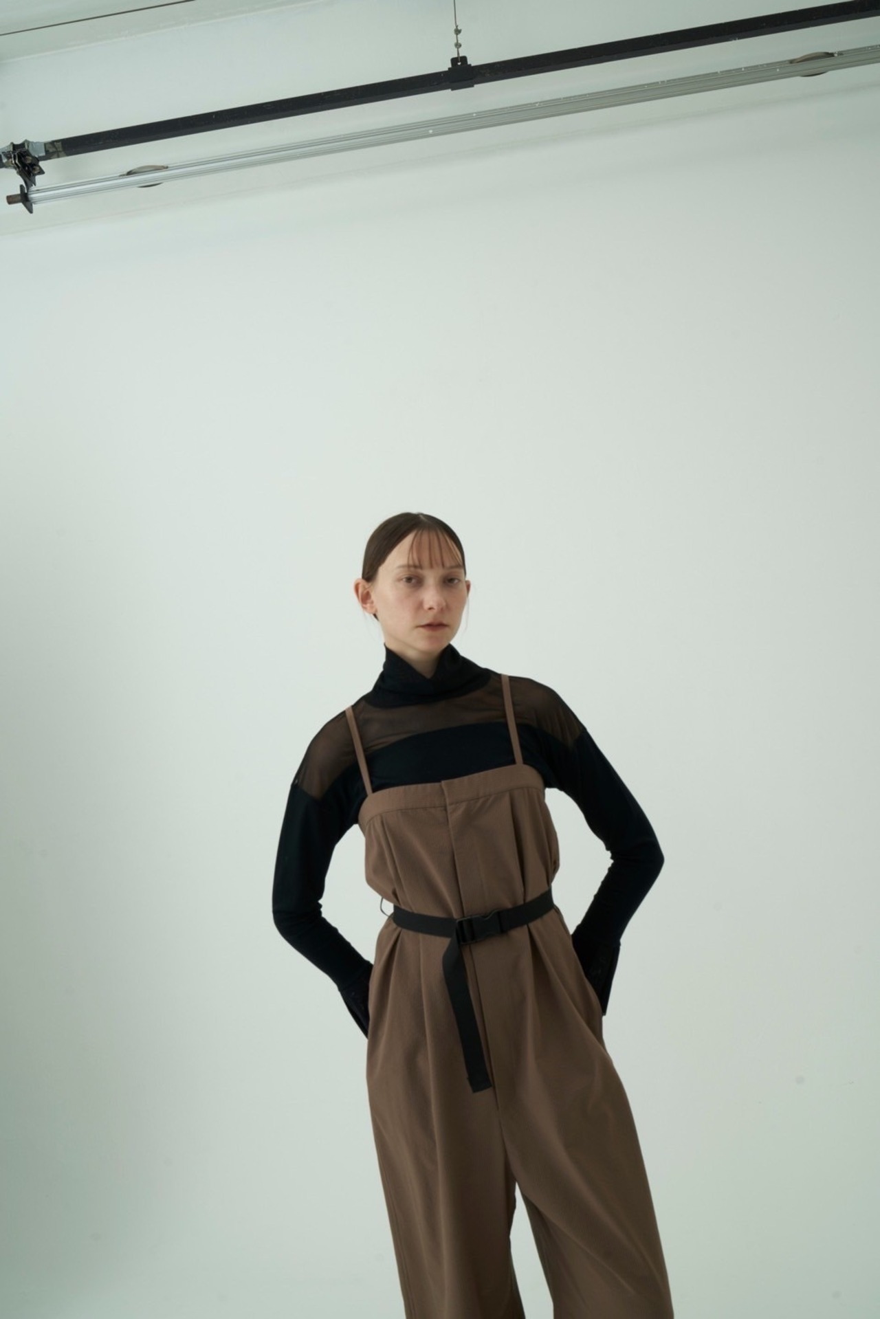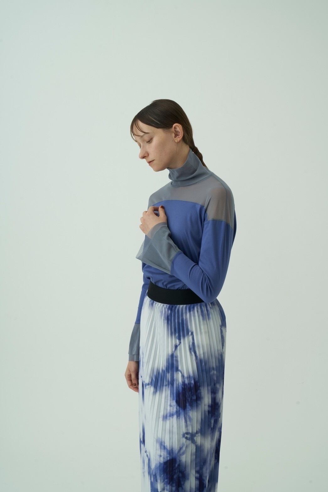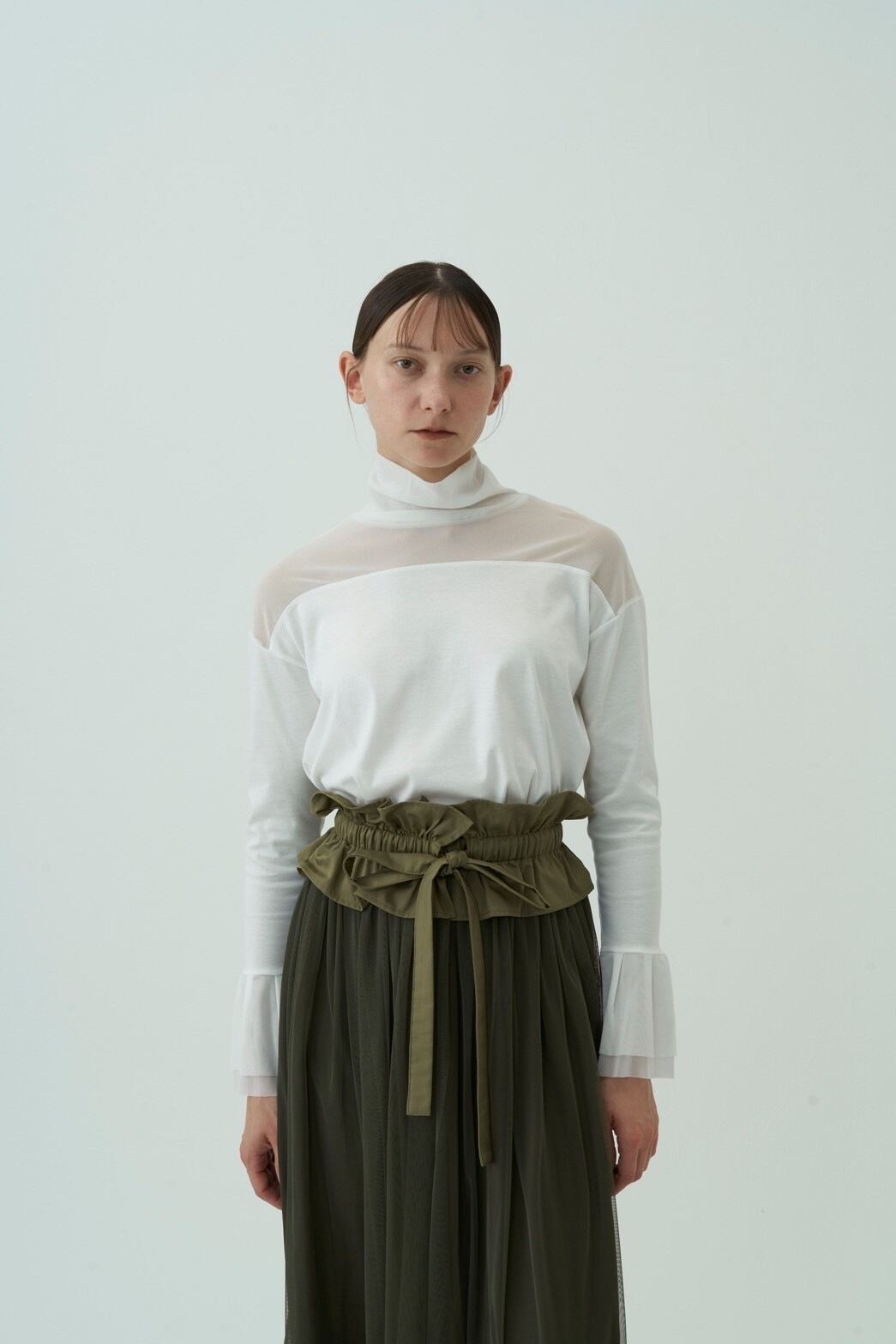 チュールとスムースを切り替えたドローストリングネックのブルオーバーです。ゆったりとしたシルエットが特徴で、リラックス感のある着心地を提供します。独口にはチュールを2枚重ねたカフスが施されており、アクセントとなっています。軽やかで透け感のあるチュール使いが、エレガントでありながらもカジュアルな印象を与えるアイテムです。