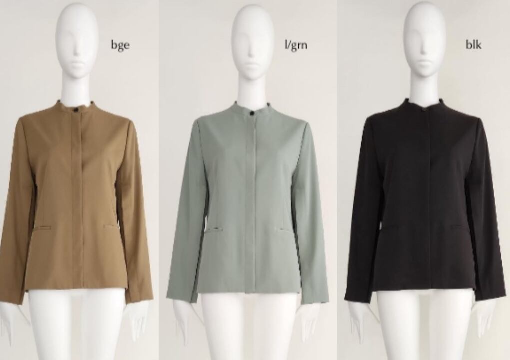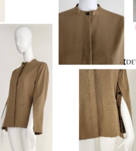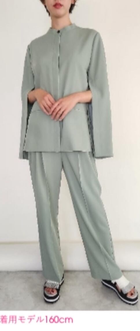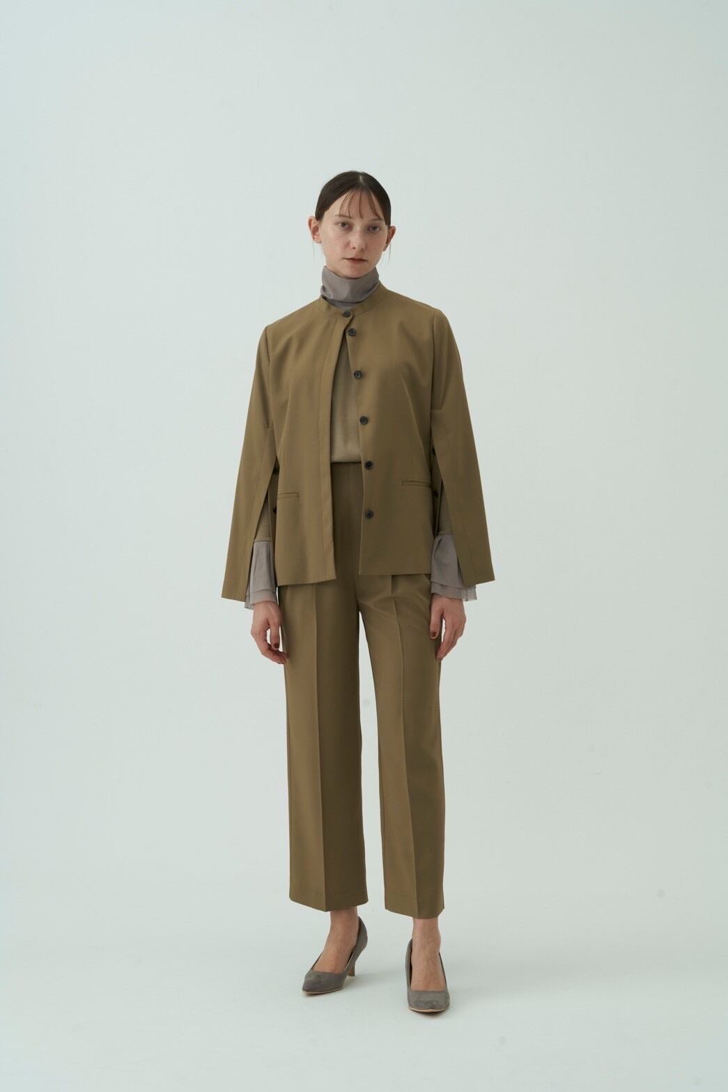 パンドカラーの比ジャケットです。前立てのボタンが見えない比関仕立てで、クリーンで洗練された印象を与えます。パンドカラーが首元をすっきりと見せ、シンプルながらもスタイリッシュなデザインが特徴です。袖部分には知で開閉できるスリットがあり、開けるとケープのようなシルエットが楽しめます。同素材のパンツとセットアップコーデも可能です。