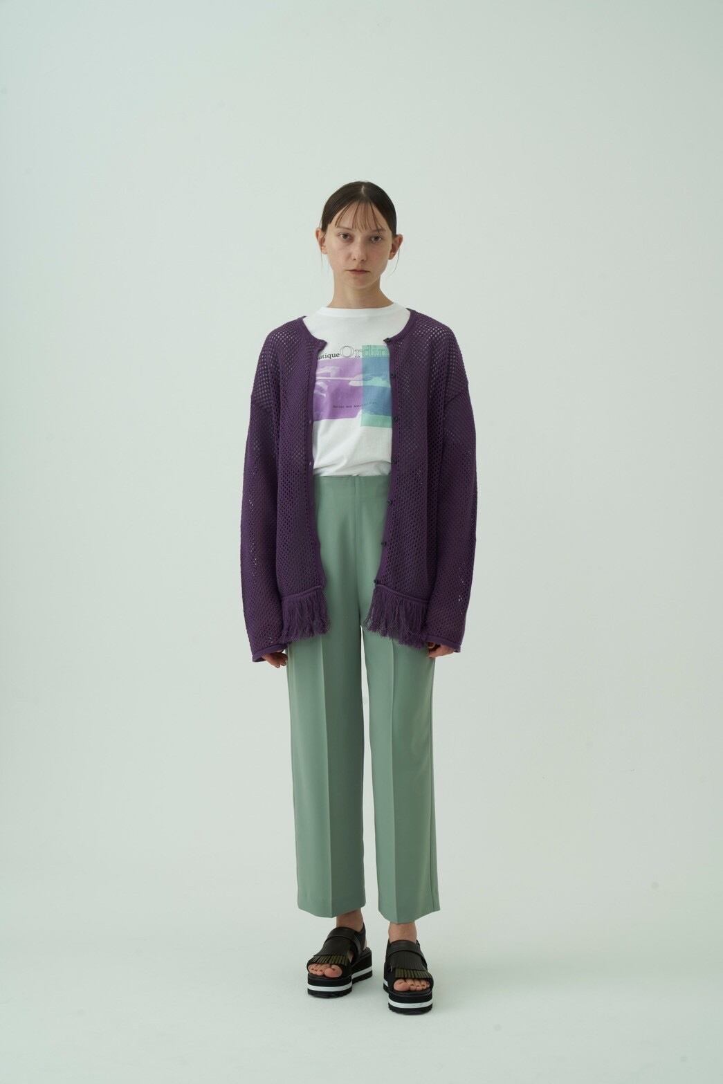 軽さがあり、程良い仲縮性とソフトで薄らかな肌触りで快適に過ごせるストレッチ合様素材を使用。マットで綺麗な表面感ととろみのあるドレープ感が、オン・オフ併用可能で長く着用出来るシーズンレスな素材です。