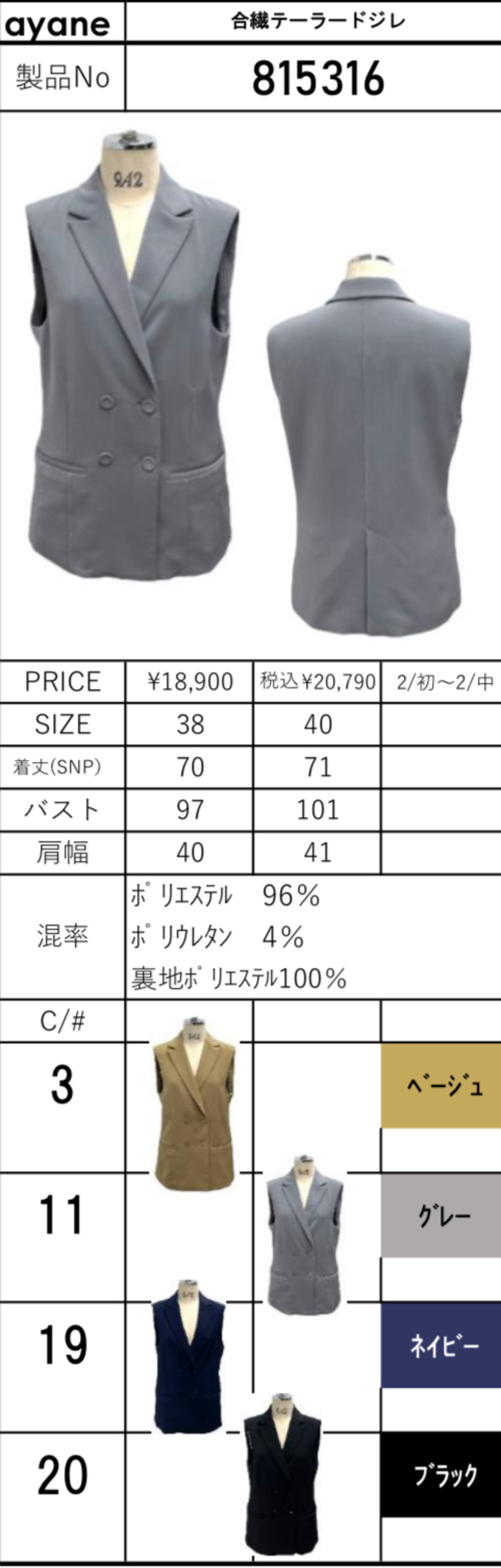 予約販売【 ayane 】合繊テーラードジレ (815316) 2月中旬お届け