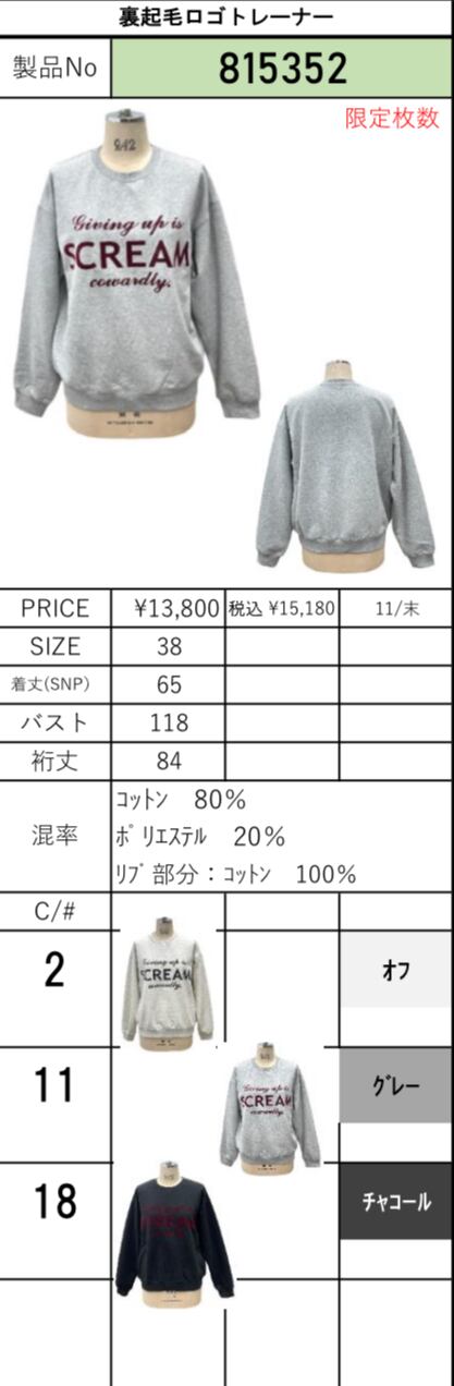 メーカー受注書に記載されている、デザイナー指示のサイズ・カラー表記を掲載しております。