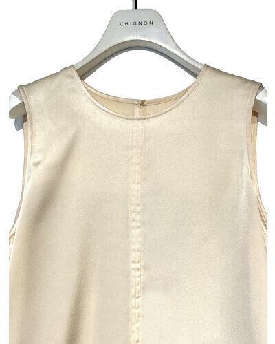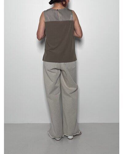 後身頃にリブ生地を使用、一見ブラウスのように見えるすっきりとしたサイズ感のインナーとして着用いただけるトップスに仕上げました。カットソーのタンクトップとは一味違う、ランクアップしたタンクトップの提案です。