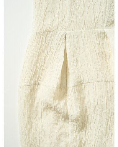 少し上に設定したウエストの両サイドにタックを入れて膨らみ感を出し、腰の位置を高く見せています。