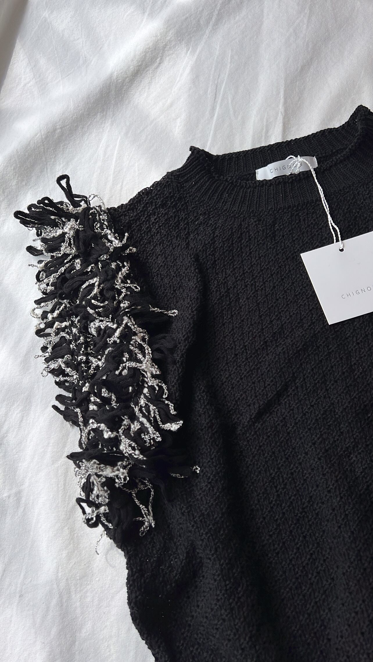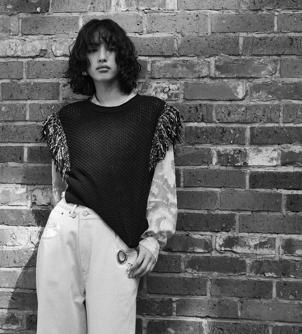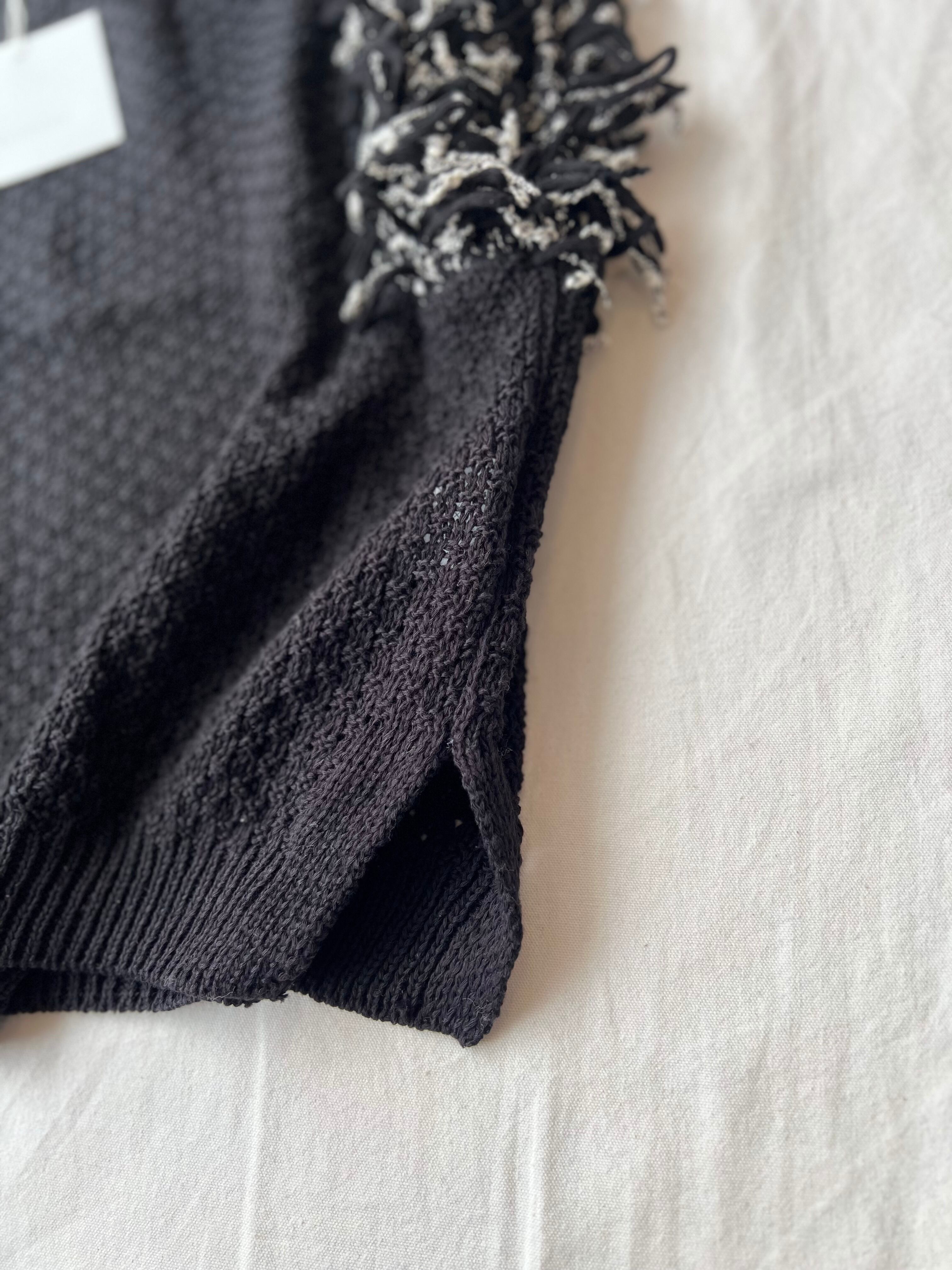 肩パネルに施したたっぷりとしたボリュームのフリンジには太さと色の異なるスラブヤーンをMIXさせています。