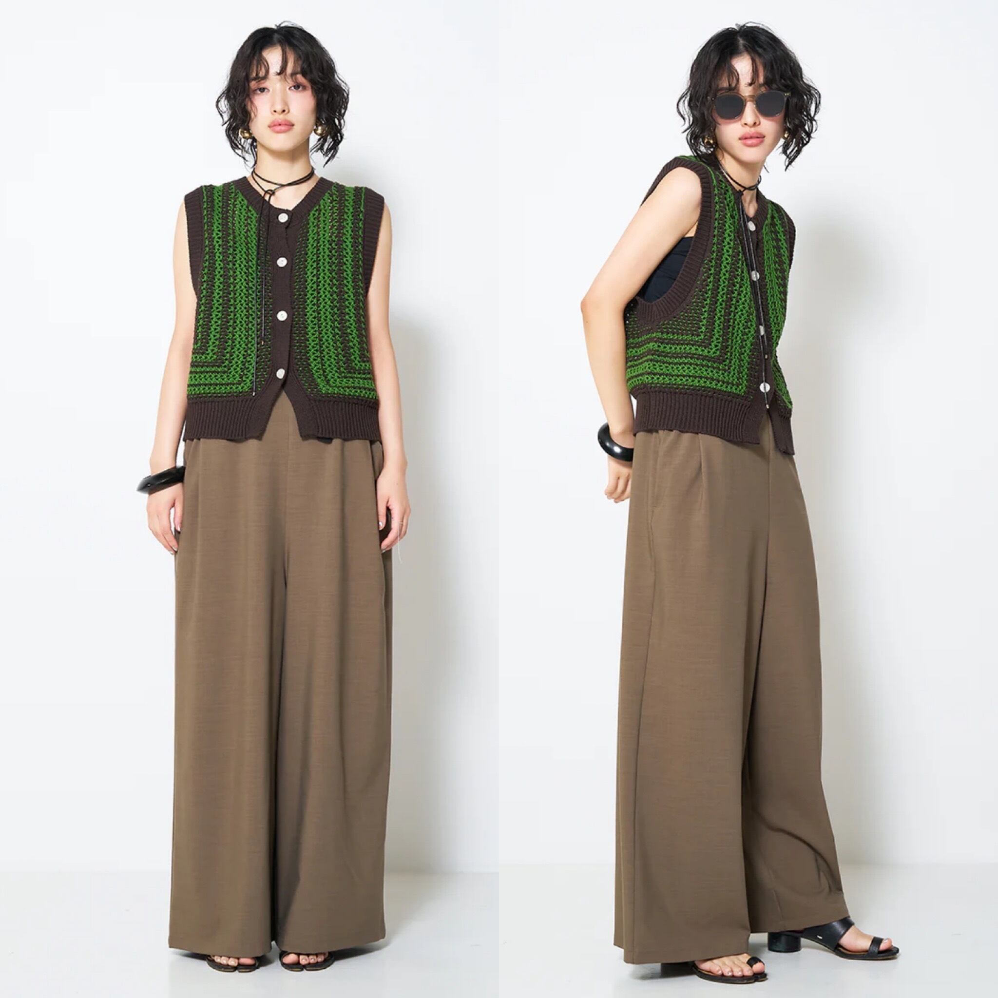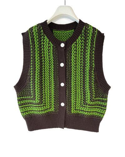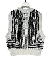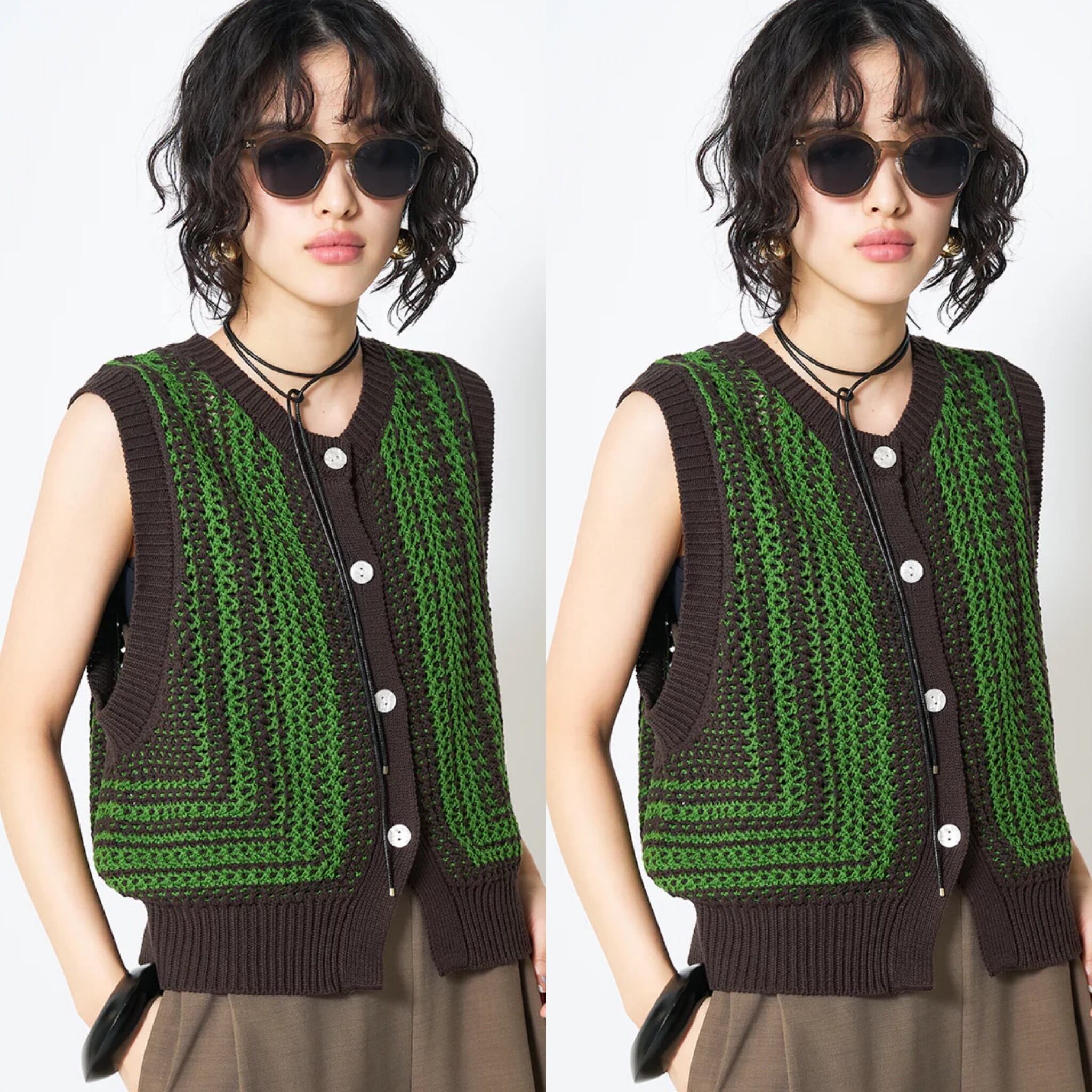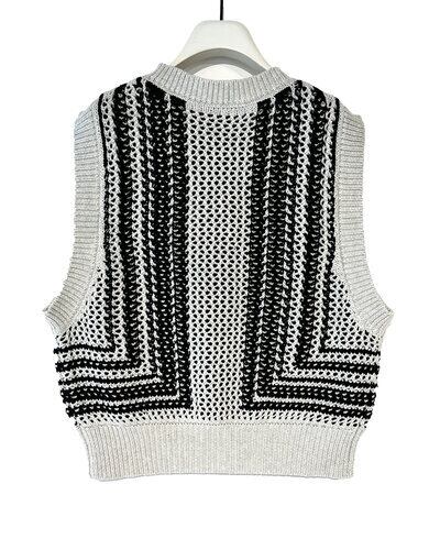 綿糸を使用したスカシ編み×パネル柄の前開きベスト。