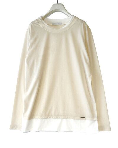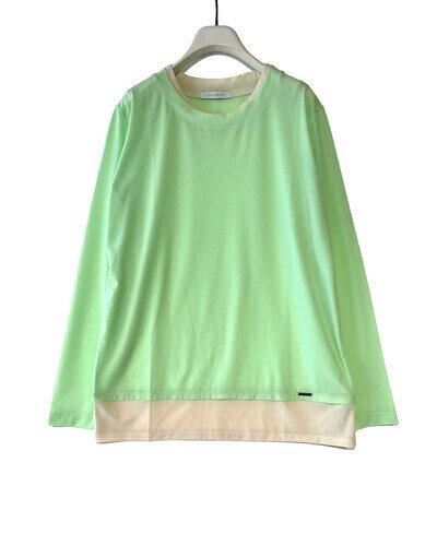 衿と裾に施した配色の切り替えで作る、同じロンTを2枚重ねしているようなデザインで、トレンドの着こなしを1枚で再現できる万能アイテムです。